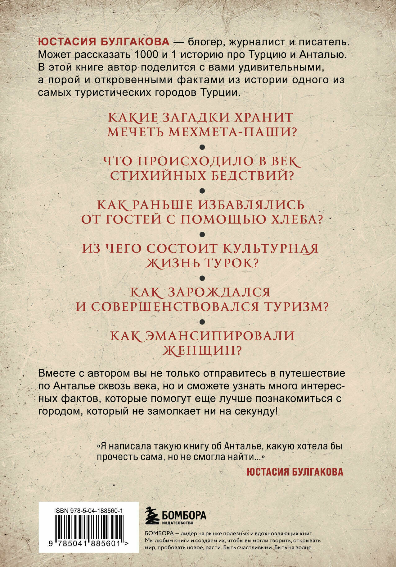 Юстасия Булгакова — блогер, журналист и писатель. Может рассказать 1000 и 1 историю про Турцию и Анталью. В этой книге автор поделится с вами самыми удивительными, а порой и откровенными фактами из истории одного из самых туристических городов Турции. Вместе с автором вы не только отправитесь в путешествие по Анталье сквозь века, но и сможете узнать много интересных фактов, которые помогут еще лучше познакомиться с городом, который не замолкает ни на секунду!