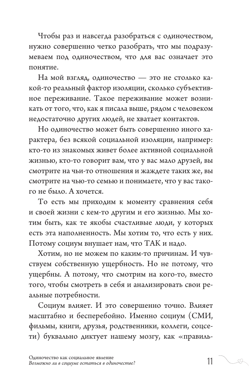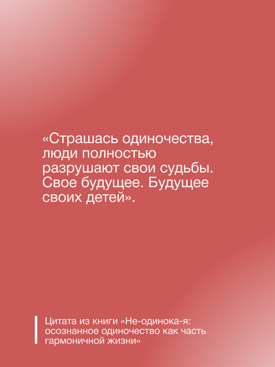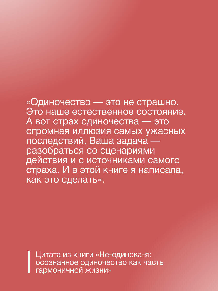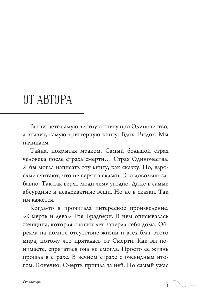 Когда вы до тошноты боитесь остаться с жизнью наедине, вы тащите в эту жизнь очень много разрушительного от неверных выборов до неподходящих людей, а с ними вы вечно в одиночестве. И это порочный круг. Эта книга послужит стартом вашего нового понимания того, что такое одиночество и как быть одинокой и счастливой.
