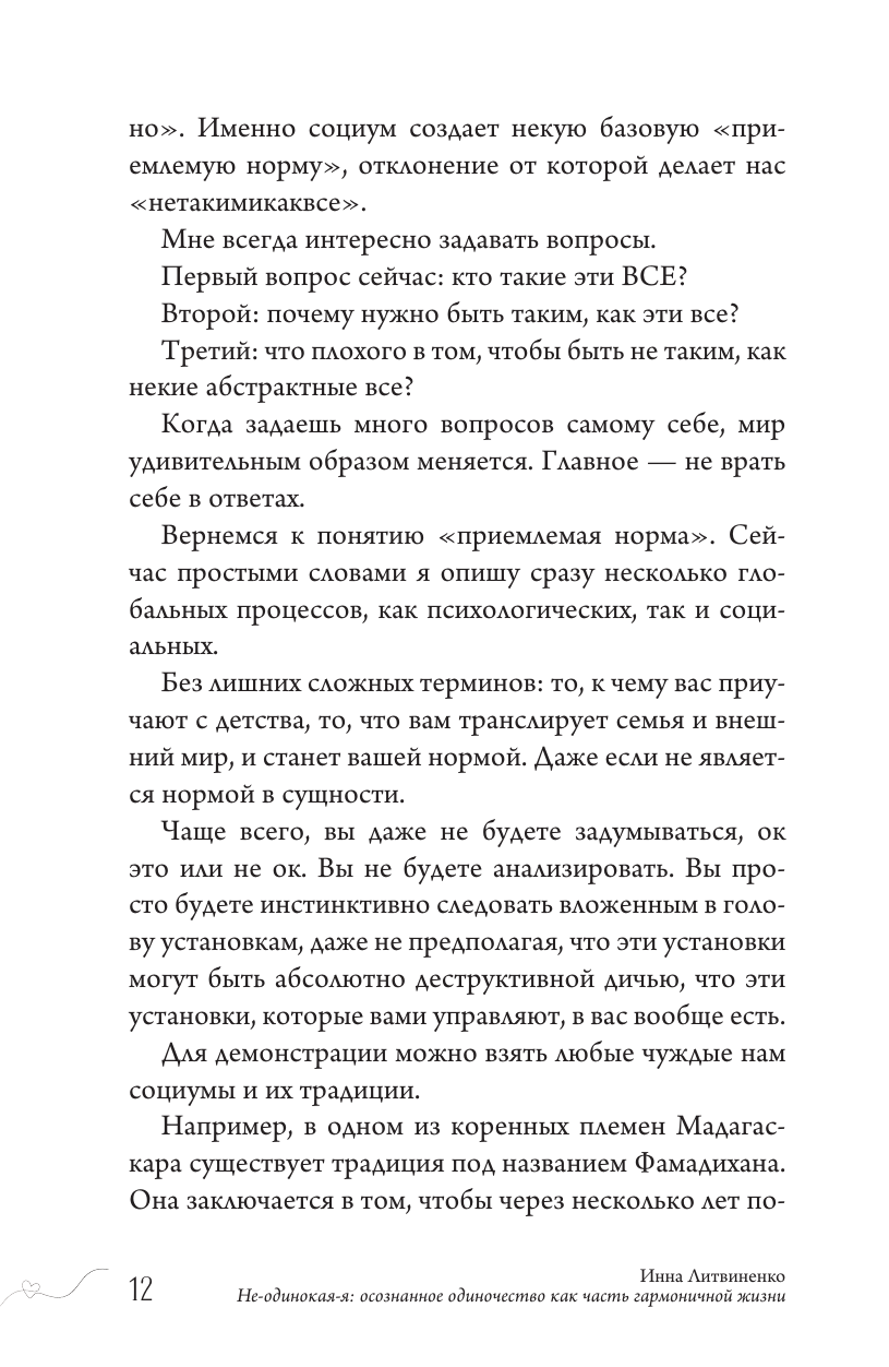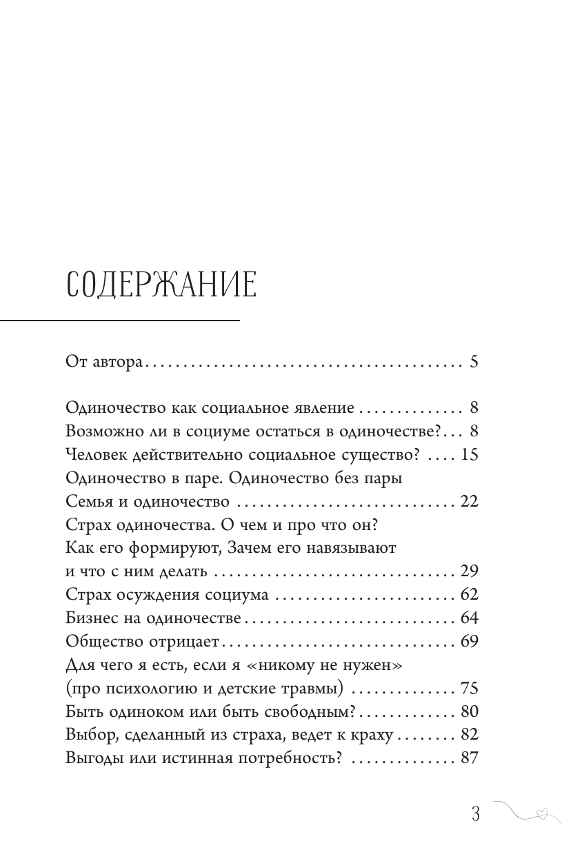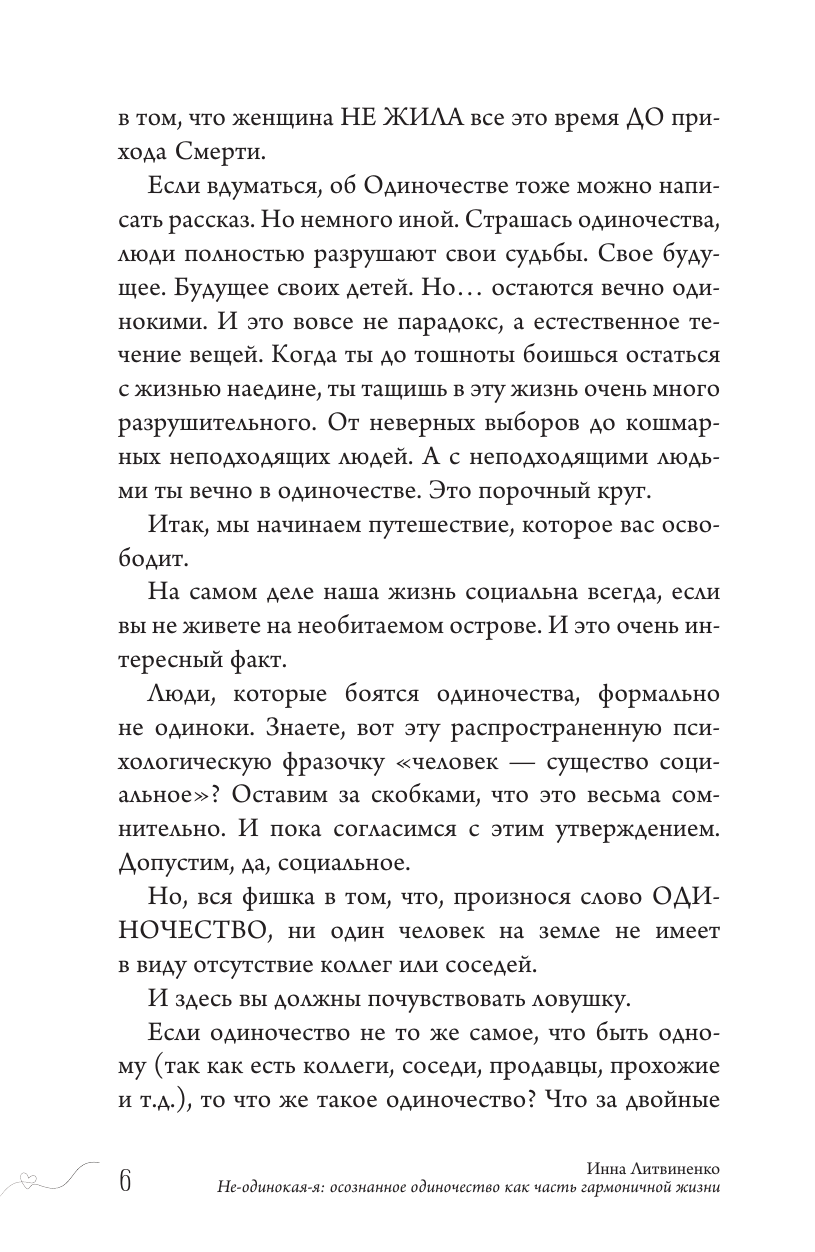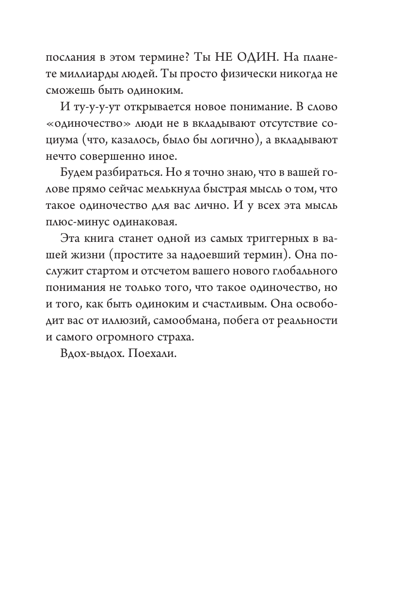 Вы начинаете увлекательное путешествие, которое освободит вас от иллюзий, самообмана, побега от реальности и самого огромного страха. Вы поймете, что одиночество может быть осознанным выбором, а жизнь одной — в кайф.