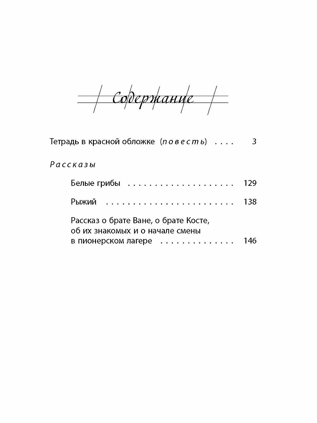 «Тетрадь в красной обложке» сборник произведений замечательного детского писателя Валерия Михайловича Воскобойникова, в который вошли одноименная повесть и несколько рассказов.Героиня повести «Тетрадь в красной обложке» Маша Никифорова удивительно искренний, честный, цельный и требовательный к себе человек. Читая страницы ее дневника, мы погружаемся в милый, немного наивный, трогательный мир душевных переживаний, наблюдаем стремление маленькой, но сильной личности стать лучше и помочь другим.Небольшие, но очень содержательные рассказы Валерия Воскобойника рассказывают о радостях и заботах мальчишек и девчонок, об их взаимоотношениях со сверстниками.Читайте всей семьей! СОДЕРЖАНИЕ:Тетрадь в красной обложке (повесть)РАССКАЗЫ:Белые грибыРыжийРассказ о брате Ване, о брате Косте, об их знакомых и о начале смены в пионерском лагере