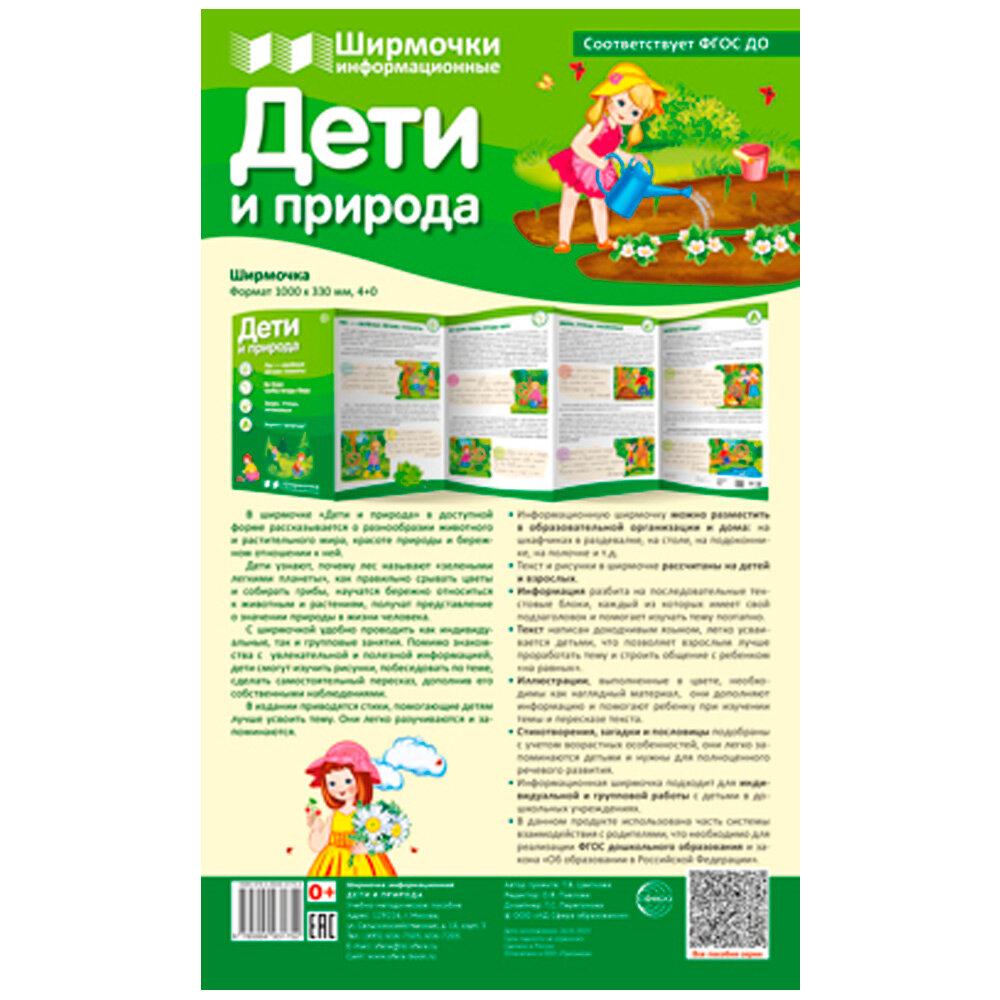 Ширмочки информационные. Дети и природа (1000х330 мм) В ширмочке «Дети и природа» в доступной форме рассказывается о разнообразии животного и растительного мира, красоте природы и бережном отношении к ней. Дети узнают, почему лес называют «зелеными легкими планеты», как правильно срывать цветы и собирать грибы, научатся бережно относиться к животным и растениям, получат представление о значении природы в жизни человека. С ширмочкой удобно проводить как индивидуальные, так и групповые занятия. Помимо знакомства с увлекательной и полезной информацией, дети смогут изучить рисунки, побеседовать по теме, сделать самостоятельный пересказ, дополнив его собственными наблюдениями. В издании приводятся стихи, помогающие детям лучше усвоить тему. Они легко разучиваются и запоминаются.