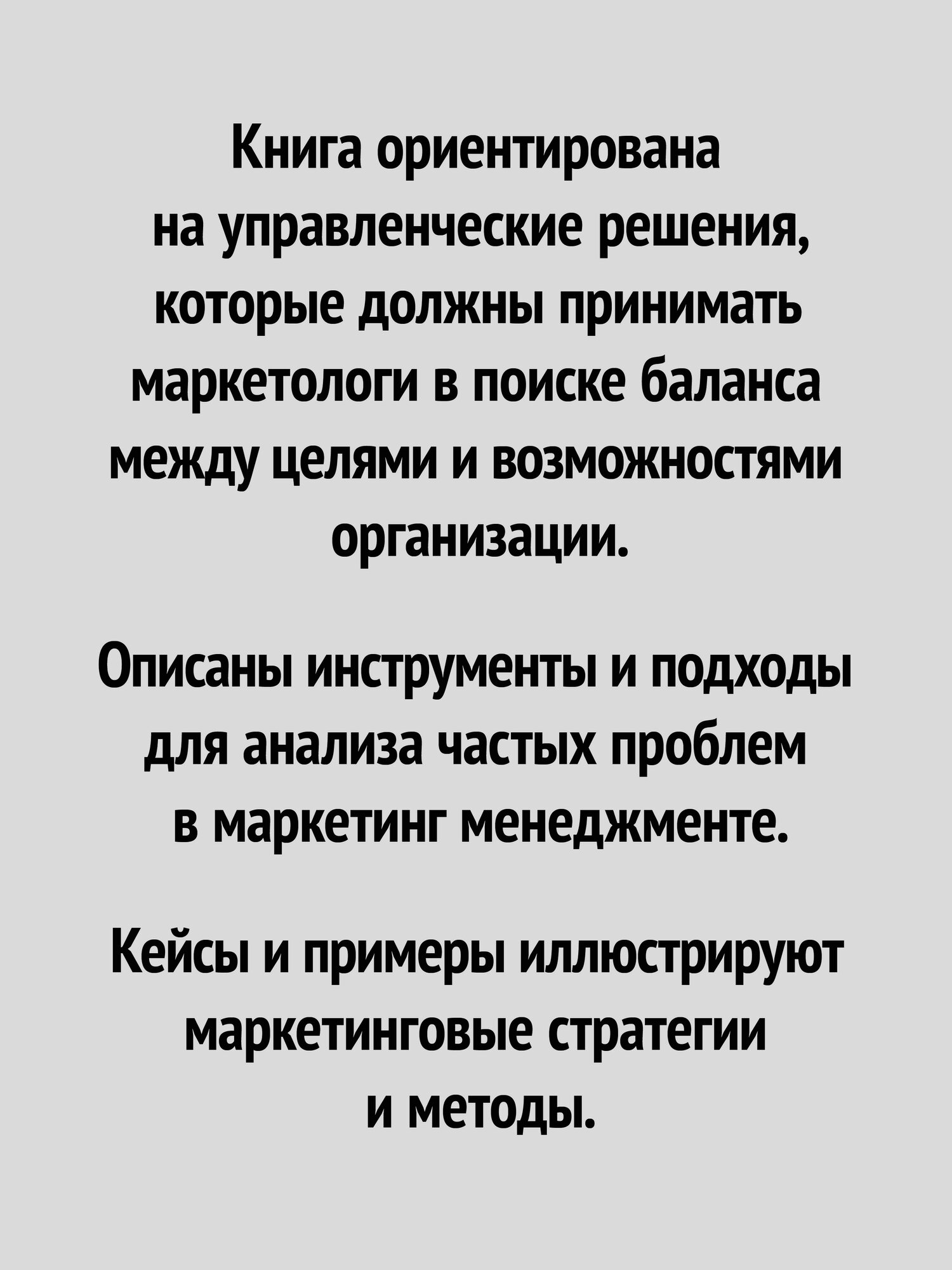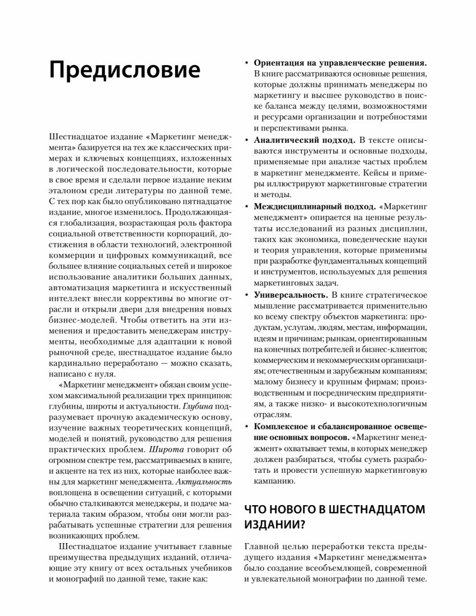 Мир маркетинга меняется каждый день. Продолжающаяся глобализация, достижения в области технологий, электронной коммерции и цифровых коммуникаций, все большее влияние социальных сетей и широкое использование аналитики больших данных, автоматизация маркетинга и искусственный интеллект внесли коррективы во многие отрасли и открыли двери для внедрения новых бизнес-моделей.Новое 16-е издание знаменитого труда классика маркетинга Филипа Котлера отражает новейшую маркетинговую теорию и практику, отличается упорядоченной организацией содержания, обновленными материалами и новыми примерами, отражающими самые последние изменения на рынке. Описываются инструменты и основные подходы, применяемые при анализе частых проблем в маркетинг менеджменте, кейсы и примеры иллюстрируют маркетинговые стратегии и методы.Издание адресовано руководителям и собственникам компаний, профессиональным маркетологам, а также студентам, обучающимся по направлению подготовки «Менеджмент».5 причин прочитать эту книгу:Книга ориентирована на управленческие решения, которые должны принимать маркетологи в поиске баланса между целями и возможностями организации.Описаны инструменты и подходы для анализа частых проблем в маркетинг менеджменте.Кейсы и примеры иллюстрируют маркетинговые стратегии и методы.Материалы основаны на результатах исследований, используемых для решения маркетинговых задач.Раскрыты вопросы, необходимые для разработки и проведения успешных маркетинговых кампаний.