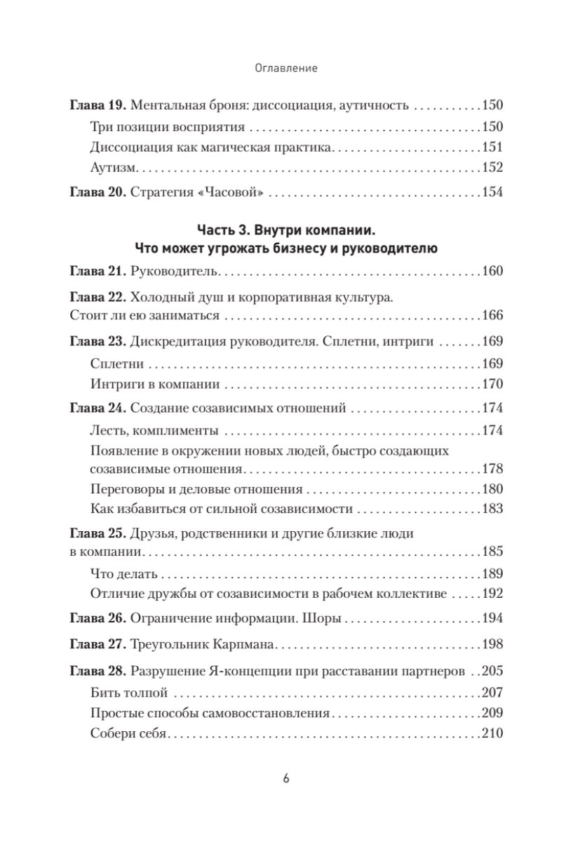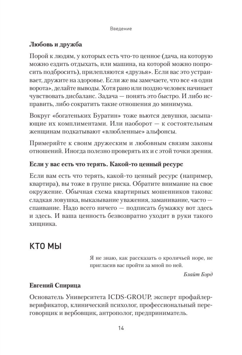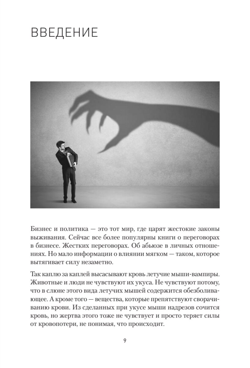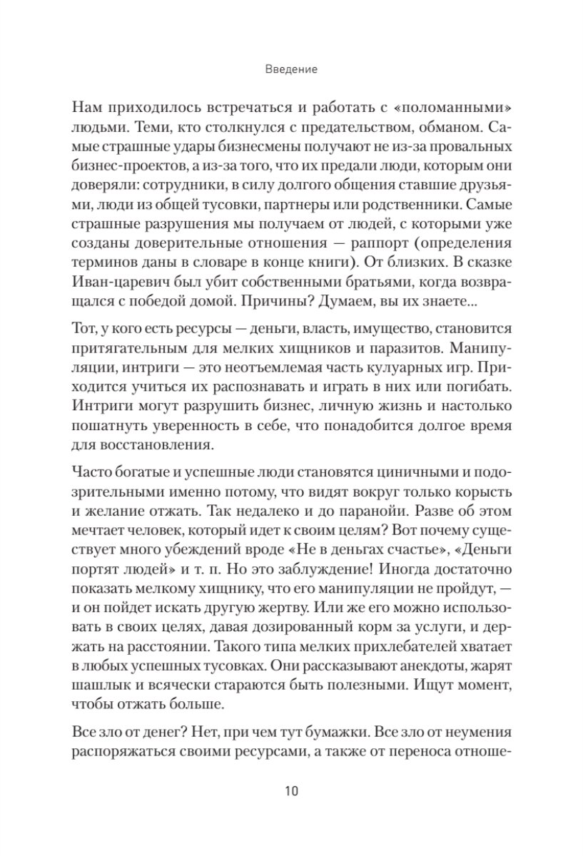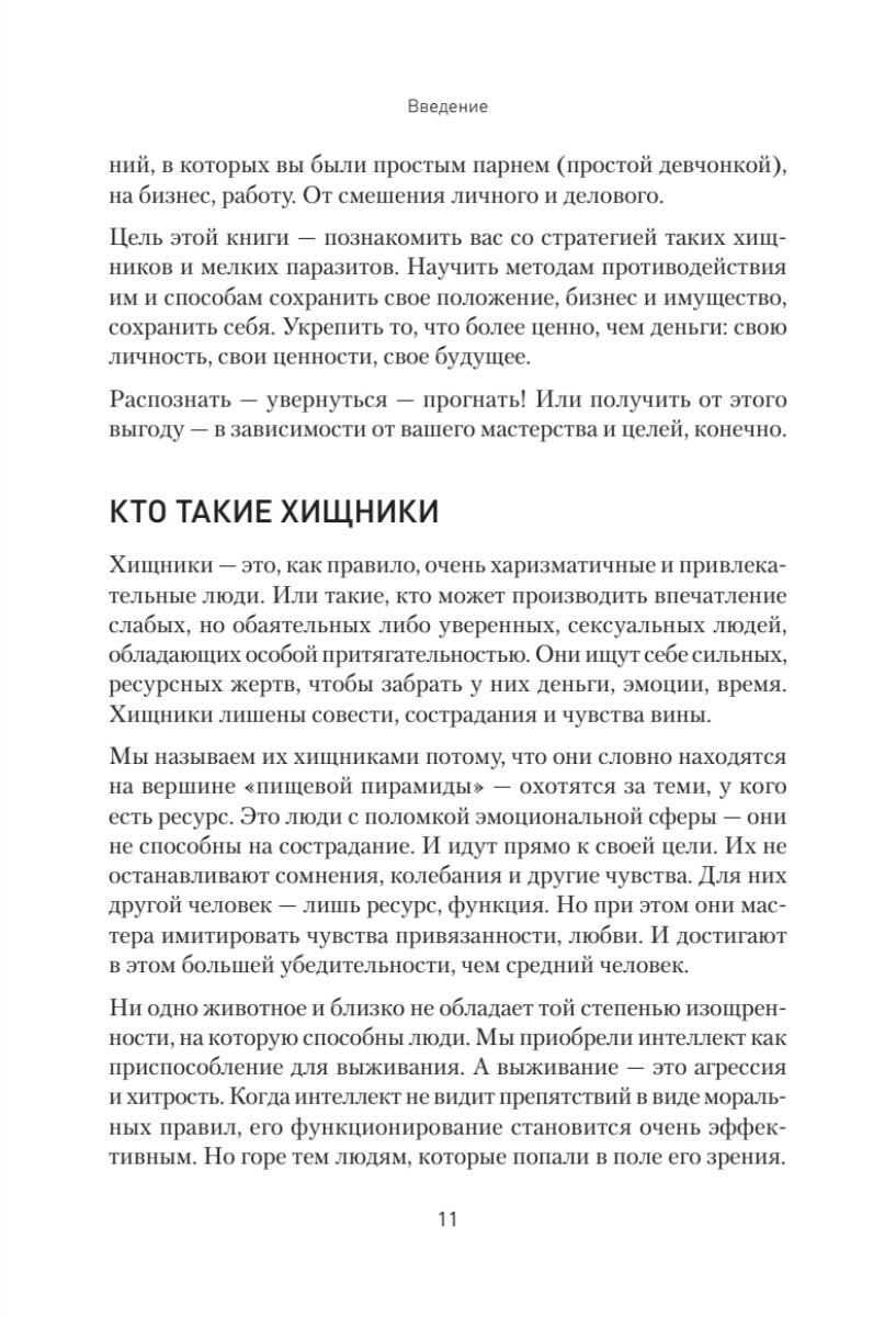Чем выше поднимается уровень благосостояния и власти человека, тем больший возникает соблазн у окружающих его нечестных людей воспользоваться знакомством с влиятельной персоной, а также его имуществом для собственного обогащения и продвижения по карьере. В книге разбираются собственные точки уязвимости состоятельного человека, которыми могут воспользоваться хищники и манипуляторы. А также показана природа поведения хищников: что ими движет и какие манипулятивные средства они используют для достижения своих целей.Также Вы увидите стратегии манипуляторов и научитесь заранее распознавать тех, кто может разрушить бизнес и личность человека; узнаете, как работает мозг сознание и бессознательное, чтобы не совершать ошибок и понимать мотивацию свою и окружающих; сможете противостоять приемам манипуляции и развить силу своей личности.В издании собран опыт бизнеса, управления, приемы боевого НЛП, приведены базовые понятия мотиваций человека с точки зрения психологии и природы человека как обычного, так и социопатов, которые являются самыми опасными, поскольку не отягощены никакими моральными правилам и эмпатией. Изложенные методики помогут лучше предугадывать свои и чужие действия, принимать эффективные решения в бизнесе и в личной жизни.Книга адресована руководителям и собственникам компаний, а также всем, кто интересуется манипуляциями, защитой, выходом из деструктивных отношений и их профилактикой.5 причин прочитать эту книгу:Защита и профилактика. Вы научитесь защищаться от манипуляций и сможете видеть маркеры возникновения проблем до их появления.Работа с состояниями. Вы узнаете, как удерживать состояние. Это главное в защите, в отличие от простого набора советов, как защититься от той или иной фразы.Разбор причин. Вы поймете, почему успешные люди попадают в ловушки, изучите мотивы, побуждающие сотрудников или партнеров вести себя нечестно.Бизнес-кейсы. Рассказы из практики авторов о способах манипуляции на уровне поведения, стратегий и ценностей послужат отличной мотивацией к развитию своей личности.Практическая польза. Простые психологические техники помогут проработать свои слабые стороны, на которые воздействует манипулятор. А знание их методов позволит не попадать в ловушки.