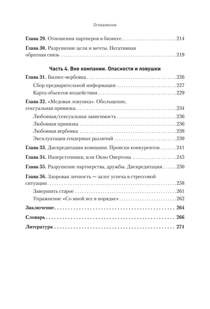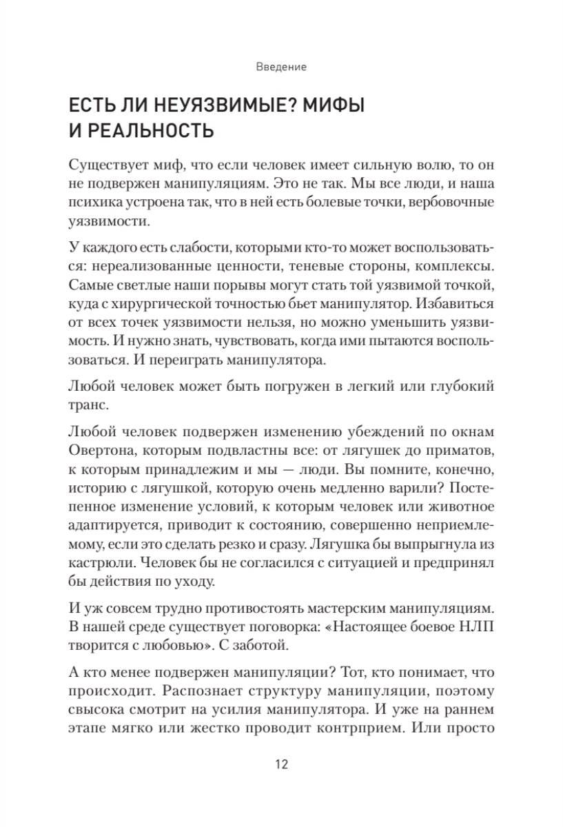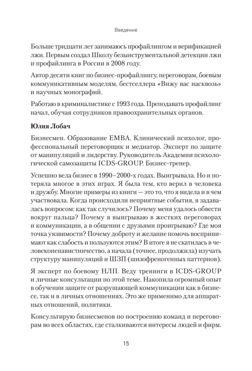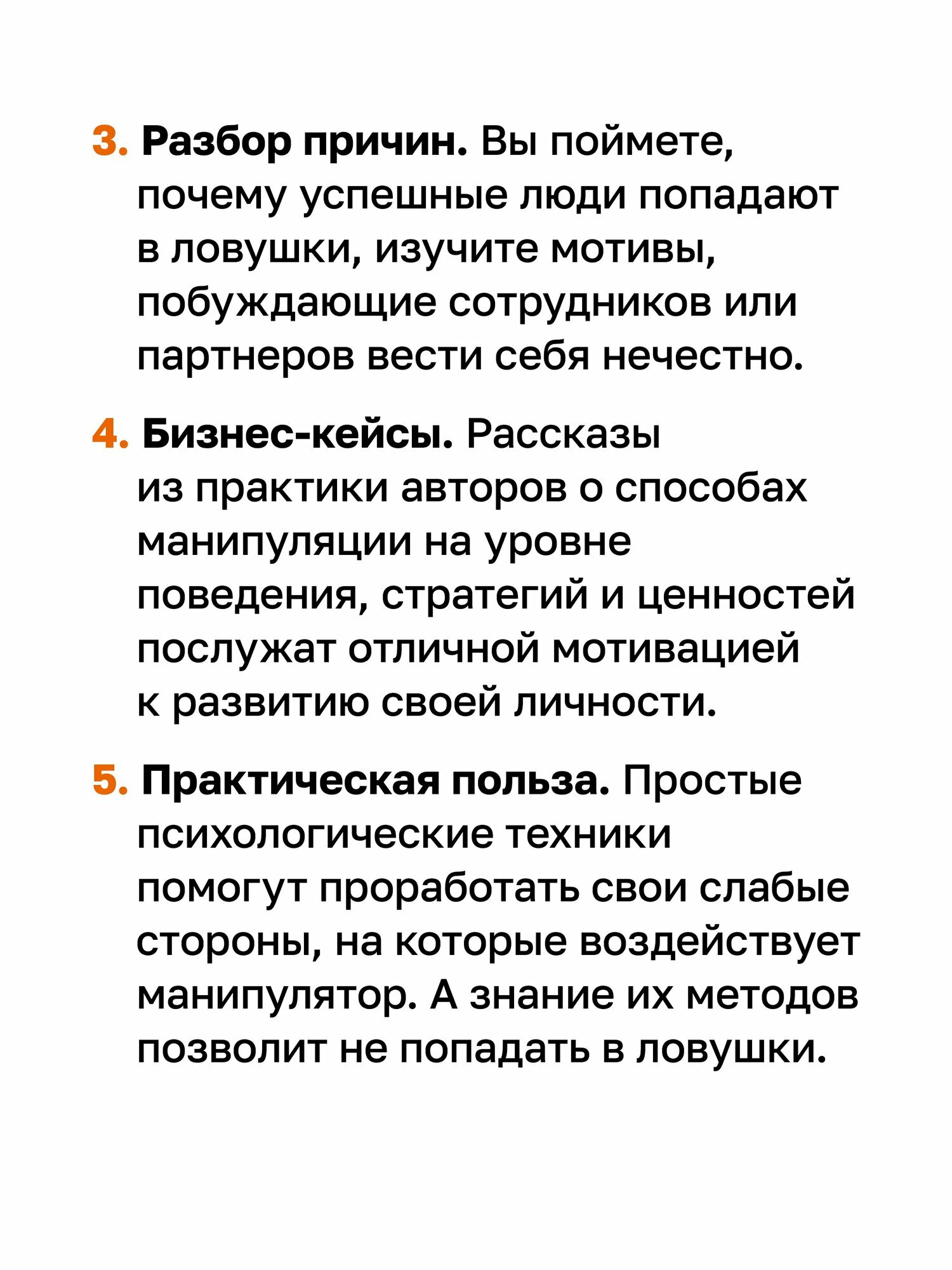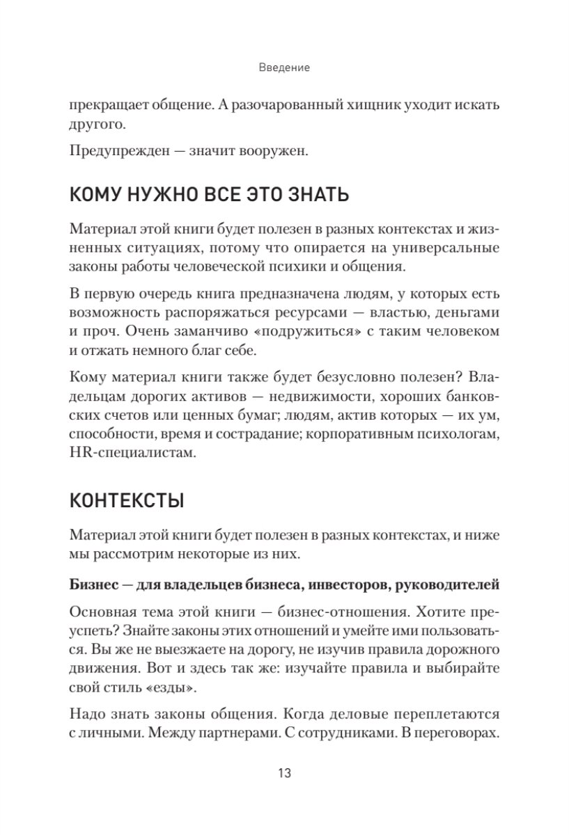 Чем выше поднимается уровень благосостояния и власти человека, тем больший возникает соблазн у окружающих его нечестных людей воспользоваться знакомством с влиятельной персоной, а также его имуществом для собственного обогащения и продвижения по карьере. В книге разбираются собственные точки уязвимости состоятельного человека, которыми могут воспользоваться хищники и манипуляторы. А также показана природа поведения хищников: что ими движет и какие манипулятивные средства они используют для достижения своих целей.Также Вы увидите стратегии манипуляторов и научитесь заранее распознавать тех, кто может разрушить бизнес и личность человека; узнаете, как работает мозг сознание и бессознательное, чтобы не совершать ошибок и понимать мотивацию свою и окружающих; сможете противостоять приемам манипуляции и развить силу своей личности.В издании собран опыт бизнеса, управления, приемы боевого НЛП, приведены базовые понятия мотиваций человека с точки зрения психологии и природы человека как обычного, так и социопатов, которые являются самыми опасными, поскольку не отягощены никакими моральными правилам и эмпатией. Изложенные методики помогут лучше предугадывать свои и чужие действия, принимать эффективные решения в бизнесе и в личной жизни.Книга адресована руководителям и собственникам компаний, а также всем, кто интересуется манипуляциями, защитой, выходом из деструктивных отношений и их профилактикой.5 причин прочитать эту книгу:Защита и профилактика. Вы научитесь защищаться от манипуляций и сможете видеть маркеры возникновения проблем до их появления.Работа с состояниями. Вы узнаете, как удерживать состояние. Это главное в защите, в отличие от простого набора советов, как защититься от той или иной фразы.Разбор причин. Вы поймете, почему успешные люди попадают в ловушки, изучите мотивы, побуждающие сотрудников или партнеров вести себя нечестно.Бизнес-кейсы. Рассказы из практики авторов о способах манипуляции на уровне поведения, стратегий и ценностей послужат отличной мотивацией к развитию своей личности.Практическая польза. Простые психологические техники помогут проработать свои слабые стороны, на которые воздействует манипулятор. А знание их методов позволит не попадать в ловушки.
