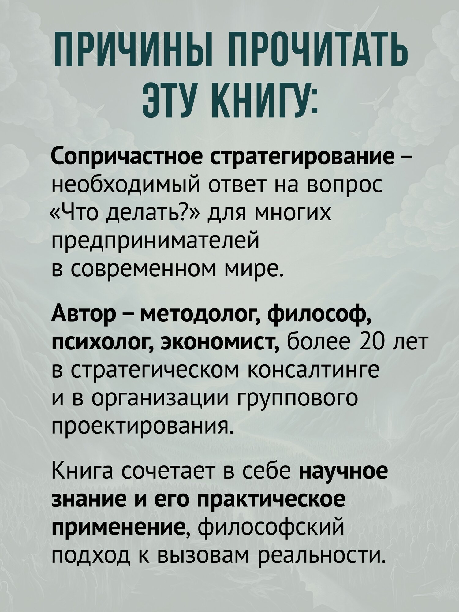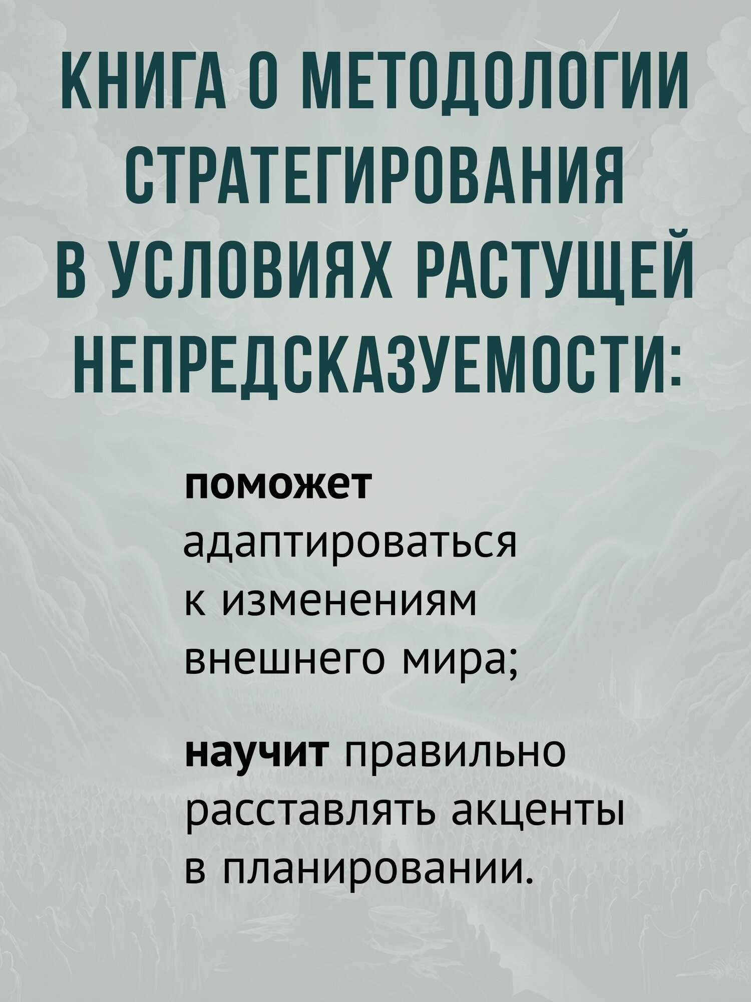 Как планировать в окружающей нас реальности? Как прописывать стратегию компании на годы вперед, если вокруг абсолютный хаос и нестабильность? Стратегии теряют свою актуальность на этапе согласования. Мир изменился и старые схемы больше не работают.В книге читатель найдет любопытный экскурс в историю стратегии, исторические и современные примеры из военной, политической и бизнес сфер. И, конечно, описание сопричастного стратегирования, которое позволит адаптироваться к изменениям внешнего мира, верно расставлять акценты и опоры в планировании и при любых обстоятельствах получать выгоду.Издание адресовано руководителям и владельцам бизнеса, практикам стратегирования и проектирования, а также всем, кто занимается долгосрочным бизнес-планированием в России.5 причин прочитать эту книгу:Сопричастное стратегирование необходимый ответ на вопрос Что делать? для многих предпринимателей в современном мире.Автор методолог, философ, психолог, экономист, более 20 лет в стратегическом консалтинге и в организации группового проектирования.Книга сочетает в себе научное знание и его практическое применение, философский подход к вызовам реальности.Издание составлено с учетом применения в современной России, содержит примеры и отсылки к реальным проектам.Узнаете, как решать практические задачи, организуя и направляя групповую работу в разработку и реализацию стратегии, вовлекая максимум заинтересованных сторон.