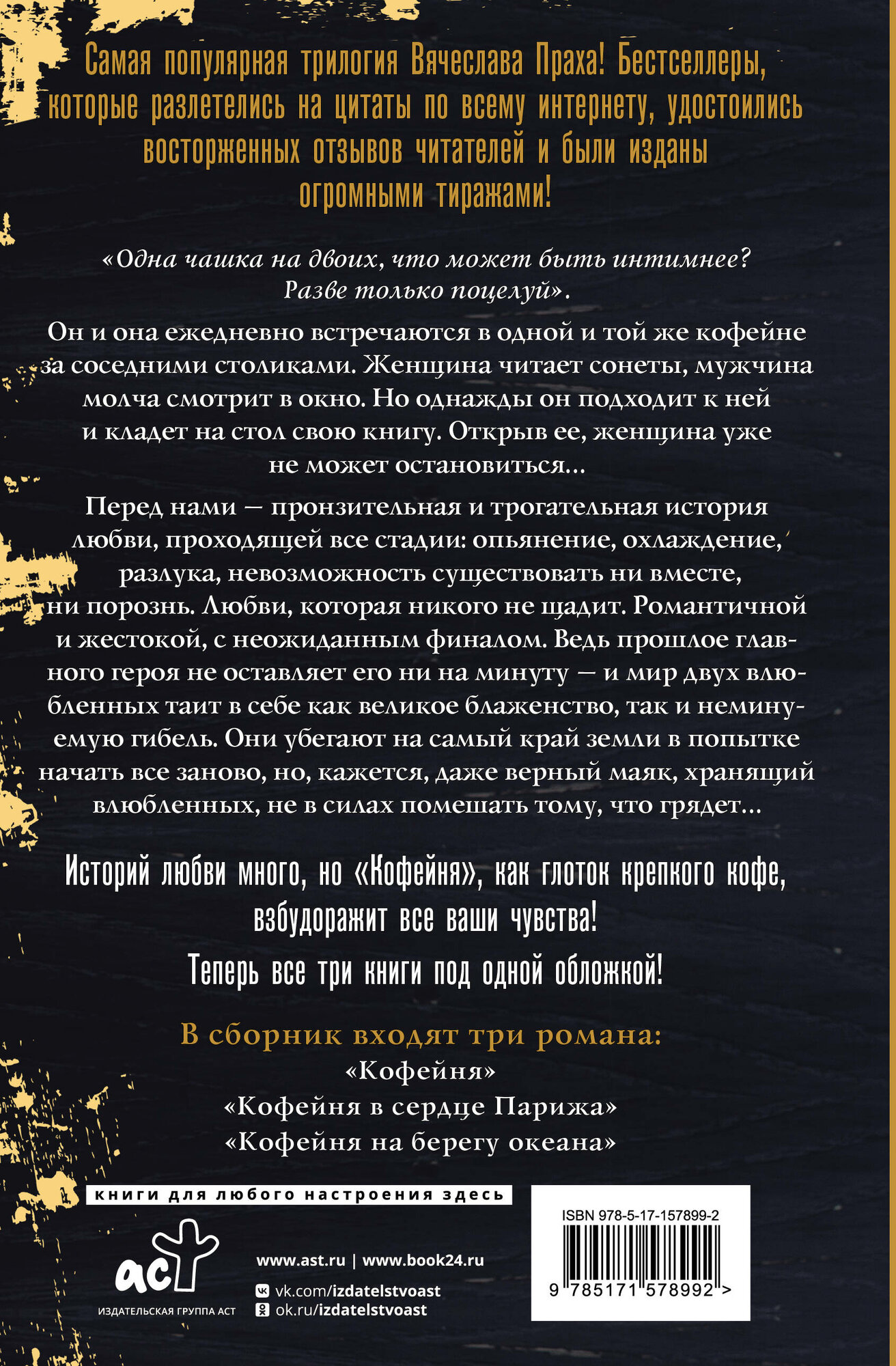 Самая популярная трилогия Вячеслава Праха! Бестселлеры, которые разлетелись на цитаты по всему интернету, удостоились восторженных отзывов читателей и были изданы огромными тиражами! «Одна чашка на двоих, что может быть интимнее? Разве только поцелуй». Он и она ежедневно встречаются в одной и той же кофейне за соседними столиками. Женщина читает сонеты, мужчина молча смотрит в окно. Но однажды он подходит к ней и кладет на стол свою книгу. Открыв ее, женщина уже не может остановиться… Перед нами — пронзительная и трогательная история любви, проходящей все стадии: опьянение, охлаждение, разлука, невозможность существовать ни вместе, ни порознь. Любви, которая никого не щадит. Романтичной и жестокой, с неожиданным финалом. Ведь прошлое главного героя не оставляет его ни на минуту — и мир двух влюбленных таит в себе как великое блаженство, так и неминуемую гибель. Они убегают на самый край земли в попытке начать все заново, но, кажется, даже верный маяк, хранящий влюбленных, не в силах помешать тому, что грядет… В сборник входят романы: «Кофейня», «Кофейня в сердце Парижа», «Кофейня на берегу океана». Историй любви много, но «Кофейня», как глоток крепкого кофе, взбудоражит все ваши чувства! Теперь все три книги под одной обложкой!