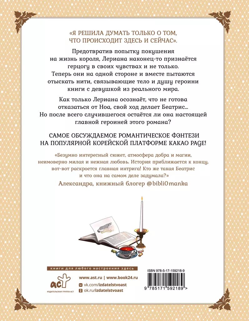 Предотвратив попытку покушения на жизнь короля, Лериана наконец-то признаётся герцогу в своих чувствах и не только. Теперь они на одной стороне и вместе пытаются отыскать нити, связывающие тело и душу героини книги с девушкой из реального мира. Как только Лериана осознаёт, что не готова отказаться от Ноа, свой ход делает Беатрис… Но после всего случившегося остаётся ли она настоящей главной героиней этого романа?