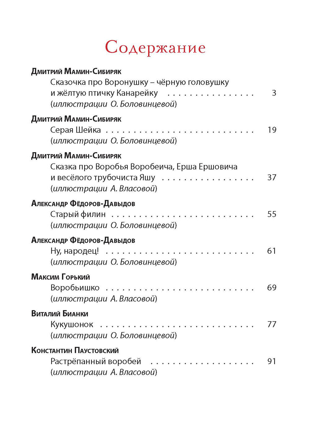 В этой очень "звонкой" книжке живёт множество птиц. Тут бок о бок распевают скворцы и синички, чирикают воробьи, кричат вороны и ухают филины... И у всех свои радости и горести, заботы и волнения. Добрые и весёлые, трогательные и поучительные истории про шумный птичий народец рассказывают замечательные русские писатели Дмитрий Мамин-Сибиряк, Александр Фёдоров-Давыдов, Максим Горький, Виталий Бианки и Константин Паустовский. Птицы в этих историях очень похожи на людей, особенно в чудесных иллюстрациях Ольги Боловинцевой и Анны Власовой.Содержание:ДМИТРИЙ МАМИН-СИБИРЯКСказочка про Воронушку - чёрную головушкуи жёлтую птичку Канарейку.ДМИТРИЙ МАМИН-СИБИРЯКСерая Шейка.ДМИТРИЙ МАМИН-СИБИРЯКСказка про Воробья Воробеича, Ерша Ершовичаи весёлого трубочиста Яшу.АЛЕКСАНДР ФЁДОРОВ-ДАВЫДОВСтарый филин.АЛЕКСАНДР ФЁДОРОВ-ДАВЫДОВНу, народец!МАКСИМ ГОРЬКИЙВоробьишко.ВИТАЛИЙ БИАНКИКукушонок.КОНСТАНТИН ПАУСТОВСКИЙРастрёпанный воробей.