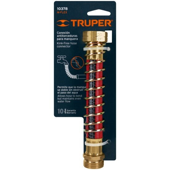 **Штуцер пружинный для шланга Truper 10378** предназначен для защиты шланга и деформации ключа. Позволяет изделию сгибаться без заломов, не препятствуя прохождению воды.