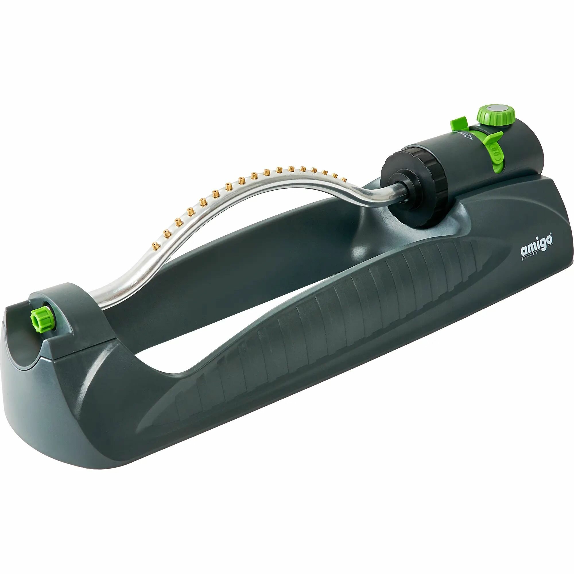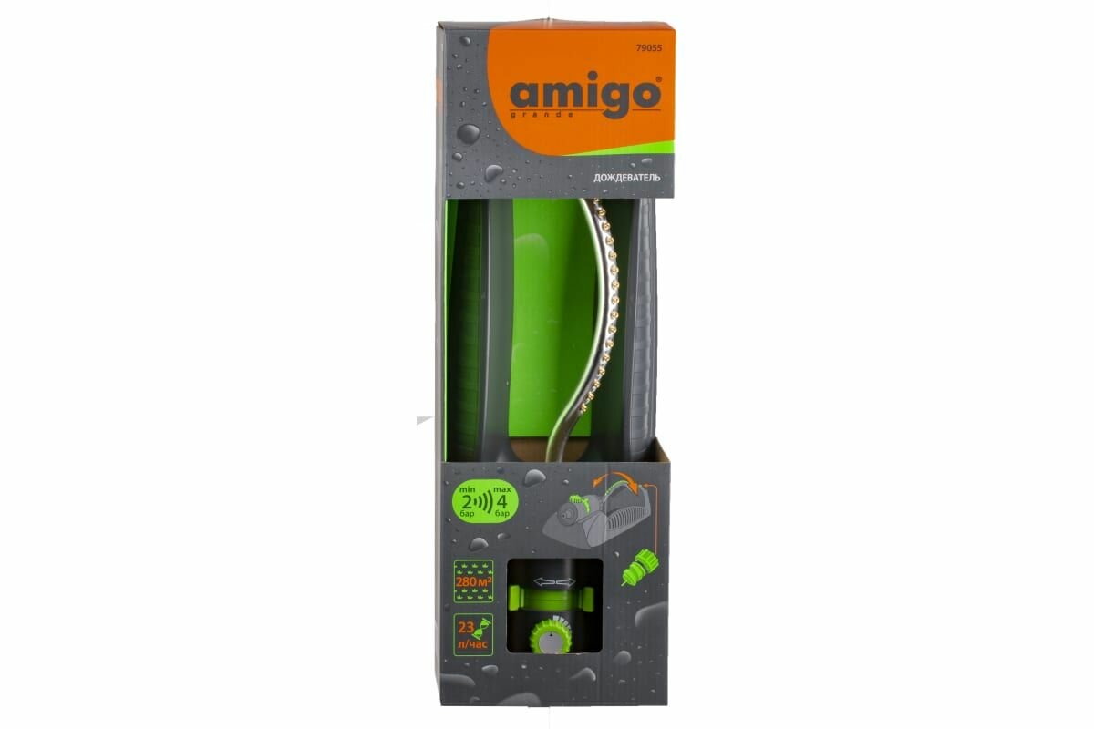 **Дождеватель Amigo 79055** предназначен для обустройства оросительной системы дачного или приусадебного участка, парка. Упрощает процесс полива и покрывает до 98 м² площади. Модель позволяет корректировать расход воды. Максимальный показатель — 100 л/ч.