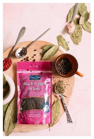 Black Pepper Whole East End Перец черный горошек — одна из самых известных специй. Она не просто придает еде пикантный вкус, но еще и оказывает благотворное воздействие на здоровье. Так, например, доказано, что черный перец помогает бороться с плохим аппетитом, укрепляет нервную систему, нормализует работу желудка и кишечника. В природе перец произрастает в лесах, а так как это растение относится к вьющимся, то неудивительно, что обычно оно обвивает стволы деревьев. Лиана перца может достигать в длину пятнадцати и даже более метров! Приготовление горошин перца — процесс трудоемкий, хотя и несложный. Вначале незрелые плоды растения собирают и обваривают в кипятке, постом долго сушат на солнце. Именно за счет тепловой обработки горошинки получаются бурыми, почти черными. Черный перец можно употреблять и горошинками, и в молотом виде, для этого вам понадобится мельница. Добавлять перец можно в супы, салаты, горячие вторые блюда, гарниры, мясо, рыбу. Способ употребления black pepper whole East End чёрного перца горошком Добавляйте перец по вкусу в любые блюда. Для получения молотой специи поместите горошины в специальную мельницу. При попадании перца в глаза промойте их водой, старайтесь не вдыхать перец, держите вдали от детей. Состав Черный перец горошком.