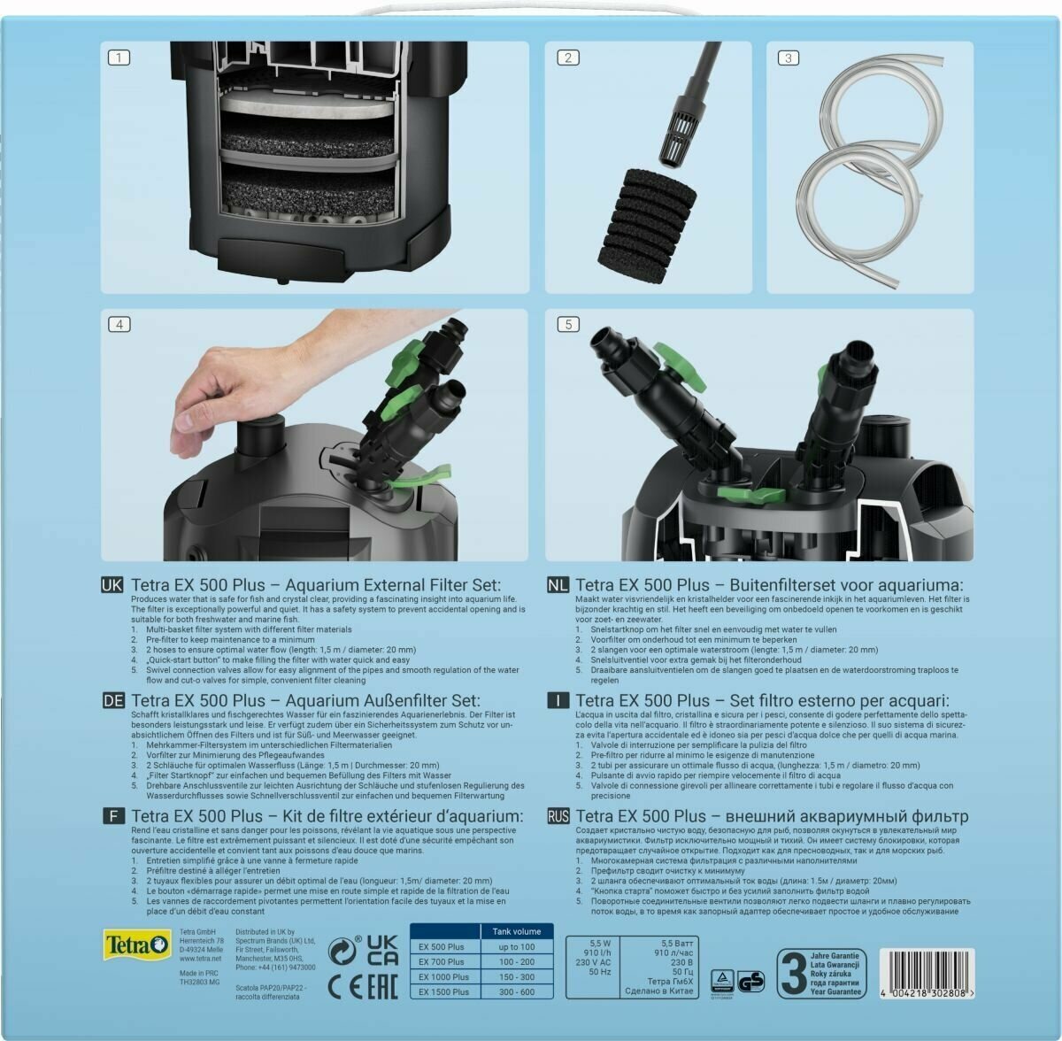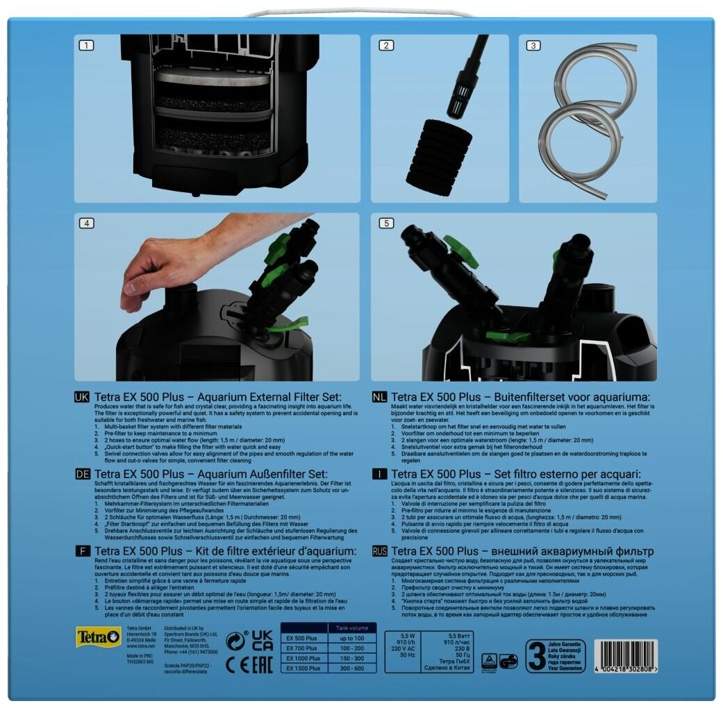Полный набор с внешним аквариумным фильтром Tetra EX 500 plus обеспечивает исключительное качество воды в аквариумах объемом до 100 л. Многоуровневая система фильтрации с различными наполнителями эффективно обеспечивает тщательную очистку аквариумной воды путем устранения излишков питательных веществ. Подробности Полный набор со всеми фильтрующими наполнителями для быстрого и простого запуска работы Создает безопасную, кристально чистую воду, которая позволит насладиться фантастической красотой подводного мира Исключительно мощный, энергоэффективный, тихий С дополнительными преимуществами, такими как кнопка старта фильтра для облегчения закачивания воды, вентилями для точного управления потоком, пре-фильтром для снижения частоты технического обслуживания Подходит для аквариумов объемом до 100 л Качество, подтвержденное сертификатами TUV/GS Дополнительная информация Для поддержания здоровья рыб и растений необходима непрерывная фильтрация аквариумной воды. Полный набор с внешним аквариумным фильтром Tetra EX 500 plus обеспечивает исключительное качество воды в аквариумах объемом до 100 л. В набор входят все необходимые фильтрующие наполнители, которые обеспечат быстрый и простой запуск, а также мгновенный вывод фильтра на полную мощность. Многоуровневая система фильтрации с различными наполнителями эффективно обеспечивает тщательную очистку аквариумной воды путем устранения излишков питательных веществ. Так владельцы аквариумов смогут насладиться подводной жизнью в кристально чистой воде. Полный набор с внешним аквариумным фильтром Tetra EX 500 plus отличается исключительной мощностью: скорость потока воды увеличена на 38 %*, при этом энергоэффективность и уровень шума остаются на прежнем уровне. Благодаря дополнительным особенностям, например кнопке старта фильтра для облегчения закачивания воды, вентилям для точного управления потоком, пре-фильтру для снижения частоты технического обслуживания, внешний фильтр Tetra EX 500 plus — это идеальный выбор для любых аквариумов.