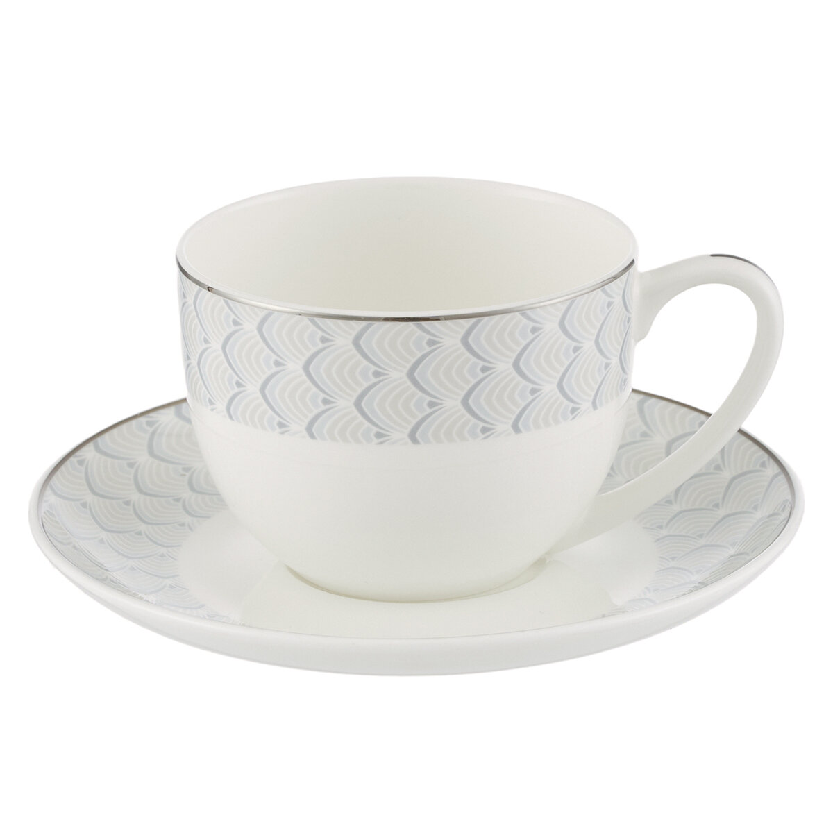 Чайная пара Gipfel Caroline выполнена в классическом стиле: белоснежную поверхность украшает по бортику изящный рельефный геометрический орнамент в молочно-серых тонах. Серебристый кант по краю дополняет композицию. Утонченные формы, элегантный декор и глянцевая поверхность делают посуду коллекции Caroline великолепным украшением стола.