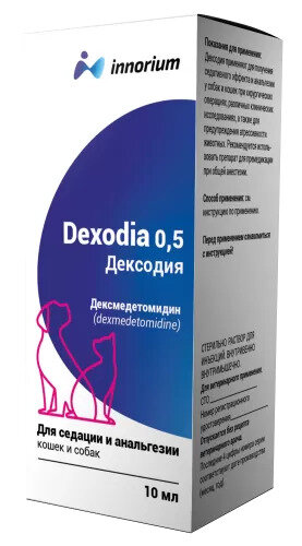 Декcодия применяют для получения седативного эффекта и анальгезии у собак и кошек при хирургичееких операциях, различных клинических исследованиях, а также для предупреждения агрccеивноcти животных. Рекомендуется использовать препарат для премедикации при общей анеcтезии.· Выпускается в двух концентрациях (0.1мг/мл и 0.5мг/мл)· Возможность сочетания с диссоциативными анестетиками (содержащие тилетамин) · Безопасен для широкого круга пациентов· Эффективен в минимальных дозировках· Обладает успокаивающим и расслабляющим эффектом· Широкие диапазоны дозировок