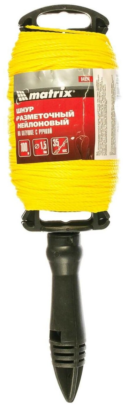 Нейлоновый разметочный шнур Matrix на катушке с ручкой, длиной 100 м и диаметром 1,5 мм, пригодится для выполнения строительно-ремонтных, земельных и хозяйственных работ. Позволяет производить разметку больших и маленьких участков, контролировать отклонения от прямолинейности при монтаже различных конструкций, кладке кирпича и т.д.Преимущества Прочность и долговечность — шнур изготовлен из нейлоновой нити, устойчивой к износу, растягиванию, воздействию щелочей, красок и солей Отличная видимость — ярко-желтый шнур хорошо заметен даже при слабом освещении Удобная эксплуатация и хранение — шнур намотан на катушку с эргономичной рукояткой из ударопрочного пластика Продуманная конструкция — в катушке имеется отверстие для зажима, которое предотвращает случайное разматывание шнура Длина 100 м — шнура хватит для выполнения большого объема работ