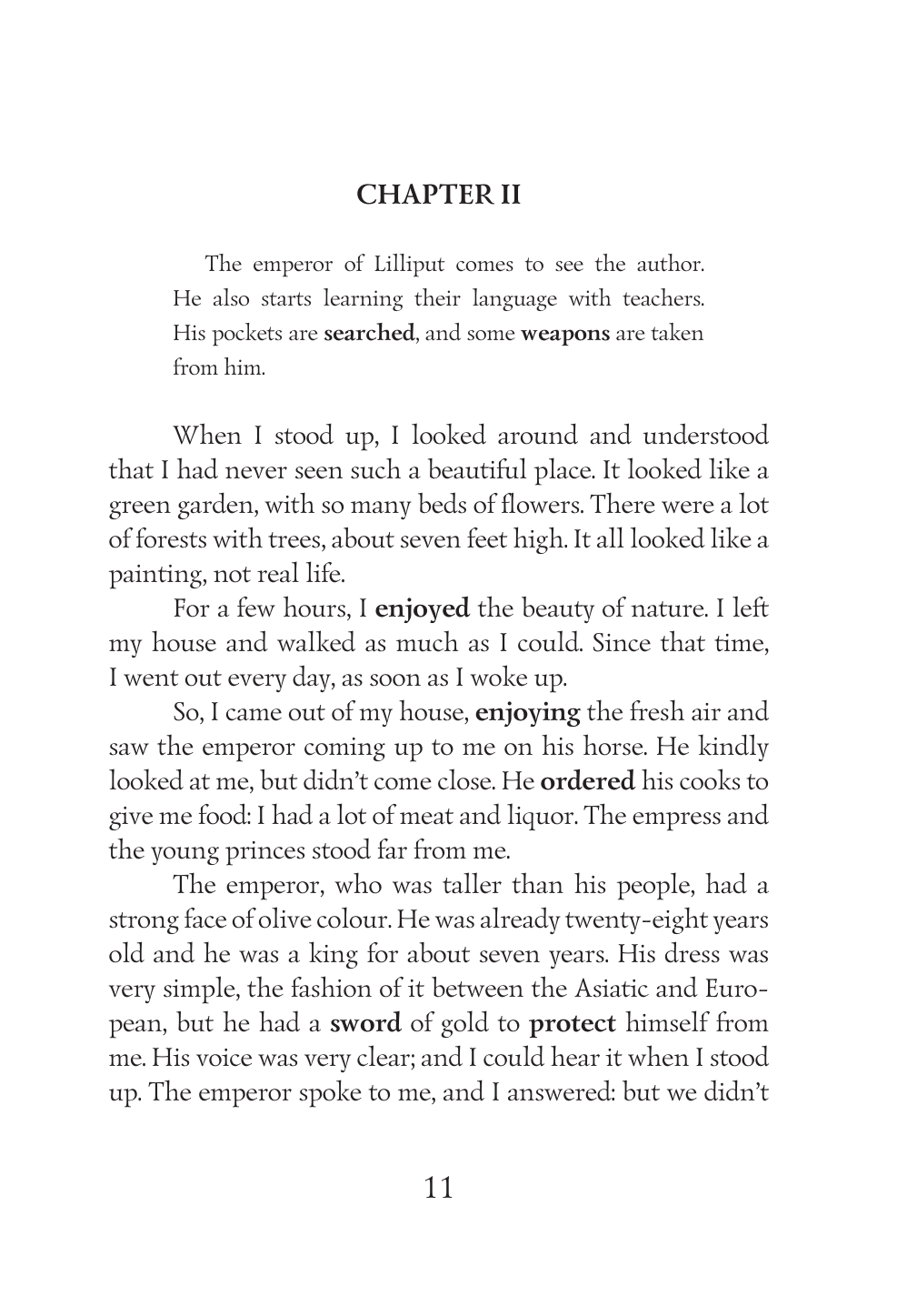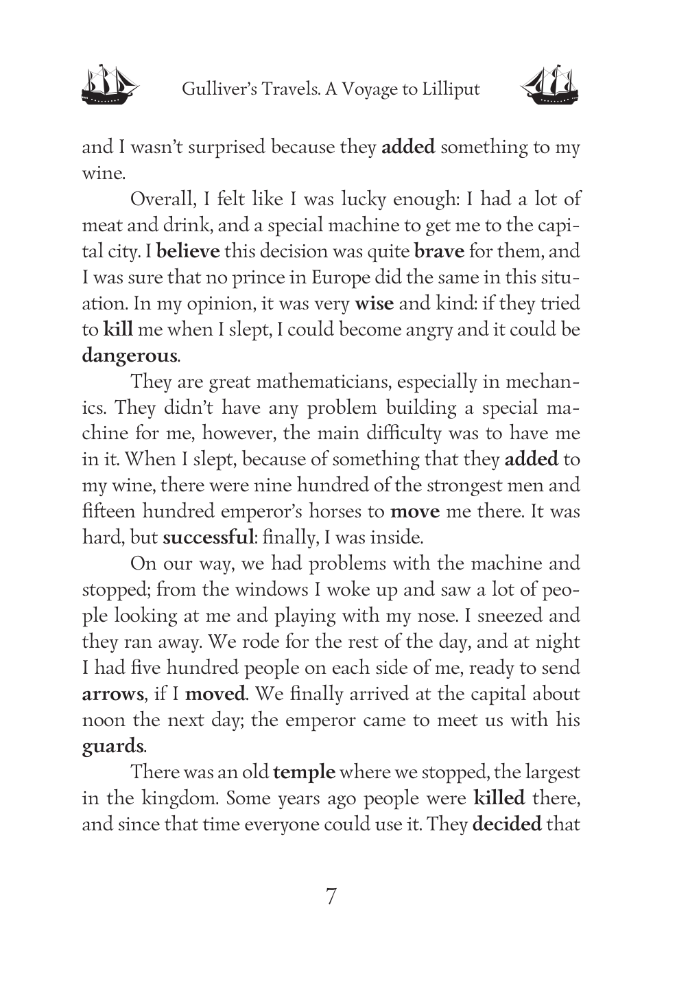 Отправьтесь в мир фантазий и путешествий со знаменитым произведением Джонатана Свифта «Гулливер в стране лилипутов». Вас ждет захватывающий рассказ о приключениях путешественника Гулливера, очутившегося в землях лилипутов – маленьких людей с необычной культурой и непредсказуемыми обычаями. Гулливеру предстоит понять их странные правила и традиции, а также столкнуться с политическими интригами и международными конфликтами. В это захватывающее приключение вплетены элементы юмора, сатиры и философских размышлений, которые не оставят вас равнодушными. Текст произведения сокращен и адаптирован для уровня A2. Все более сложные слова вы найдете в словариках, расположенных после каждой главы. В конце книги даны упражнения на проверку понимания прочитанного, закрепление новых слов и работу с текстом. Предложенные читателю задания составлены таким образом, чтобы сделать опыт взаимодействия с книгой более глубоким и многогранным.