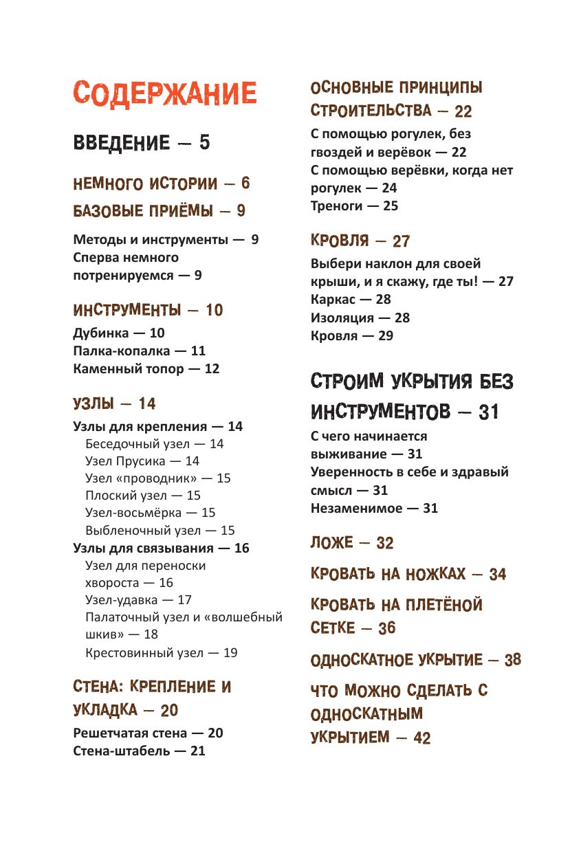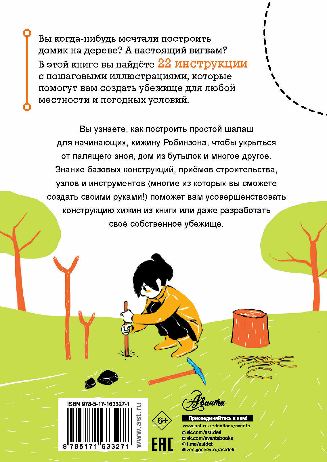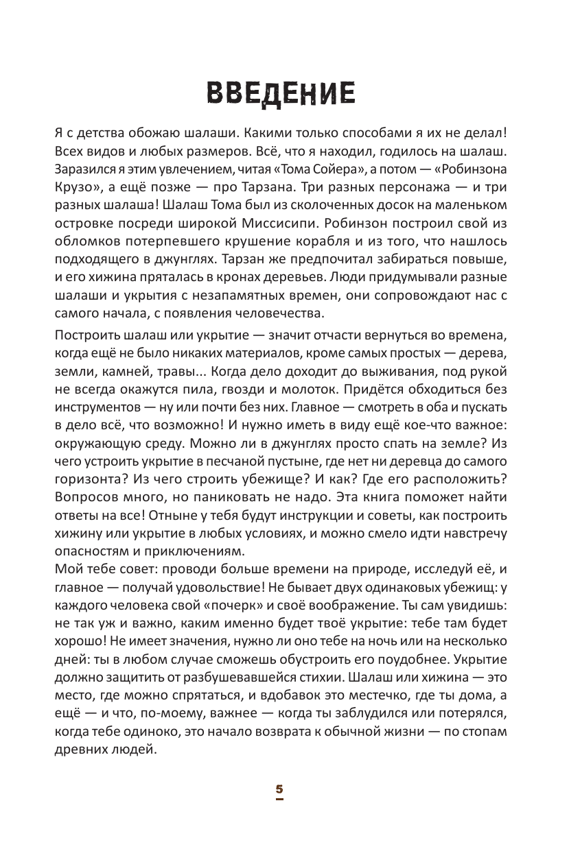 В этой книге вы найдёте 22 инструкции с пошаговыми иллюстрациями, которые помогут вам создать убежище для любой местности и погодных условий. Вы узнаете, как построить простой шалаш для начинающих, хижину Робинзона, чтобы укрыться от палящего зноя, дом из бутылок и многое другое. Знание базовых конструкций, приёмов строительства, узлов и инструментов (многие из которых вы сможете создать своими руками!) поможет вам усовершенствовать конструкцию хижин из книги или даже разработать своё собственное убежище.