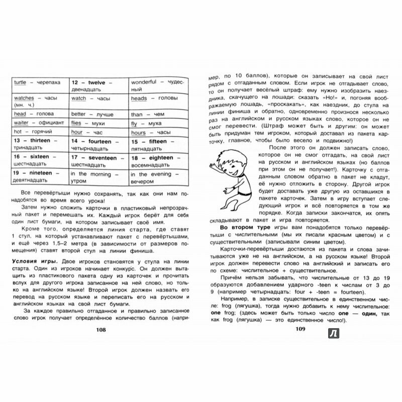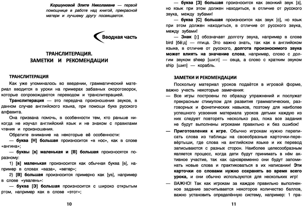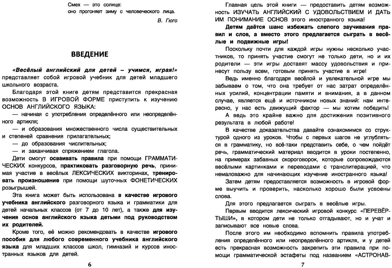 Главная цель этой книги - дать детям реальный шанс изучать английский язык с удовольствием! "Весёлый английский для детей - учимся, играя!" представляет собой игровой учебник для детей младшего школьного возраст. Благодаря этой книге детям представится прекрасная возможность в игровой форме приступить к изучению основ английского языка, начиная с употребления артикля и заканчивая спряжением глагола. Дети смогут осваивать правила при помощи грамматических эстафет, практиковать разговорную речь, принимая участие в весёлых лексических конкурсах, тренировать произношение при помощи шуточных фонетических розыгрышей. Все игры построены по образцу упражнений и могут проводиться как в домашних условиях под руководством родителей, так и в условиях организованного обучения на курсах или в школе для детей начальных классов. Для более доступного понимания правил в игры вводится множество упрощённых схем и таблиц, а также ответы для проверки. К английским словам даётся транслитерация, которая поможет всем, кто не в совершенстве владеет правилами чтения английского языка. Эти игры доставят массу удовольствия и принесут пользу и знания всем готовым принять участие в игре! 2-е издание.