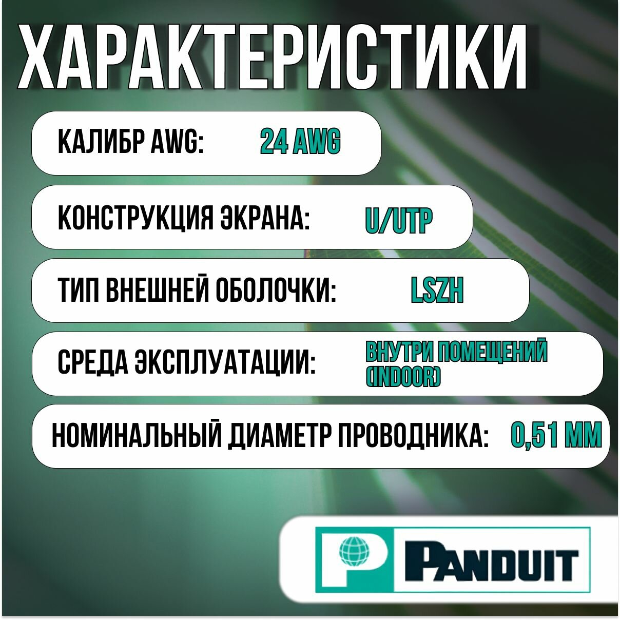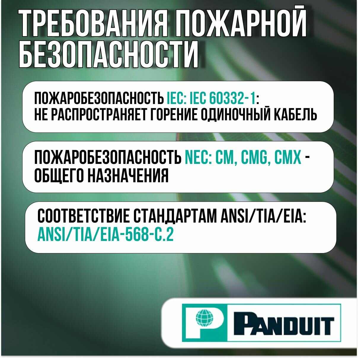 Panduit - неэкранированный кабель категории 5e. Превосходит требования стандарта TIA/EIA-568-C.2 для кабеля категории 5e. Протестирован ETL на производительность по категории 5e. Экранированный и неэкранированный кабель в оболочке из ПВХ, а также в малодымной безгалогеновой оболочке (LSZH). Поддерживает следующие протоколы: Ethernet 10Base-T, 100BASE-T (Fast Ethernet) и 1000Base-T (Gigabit Ethernet); 622Mb/s ATM; Token Ring 4/16.
