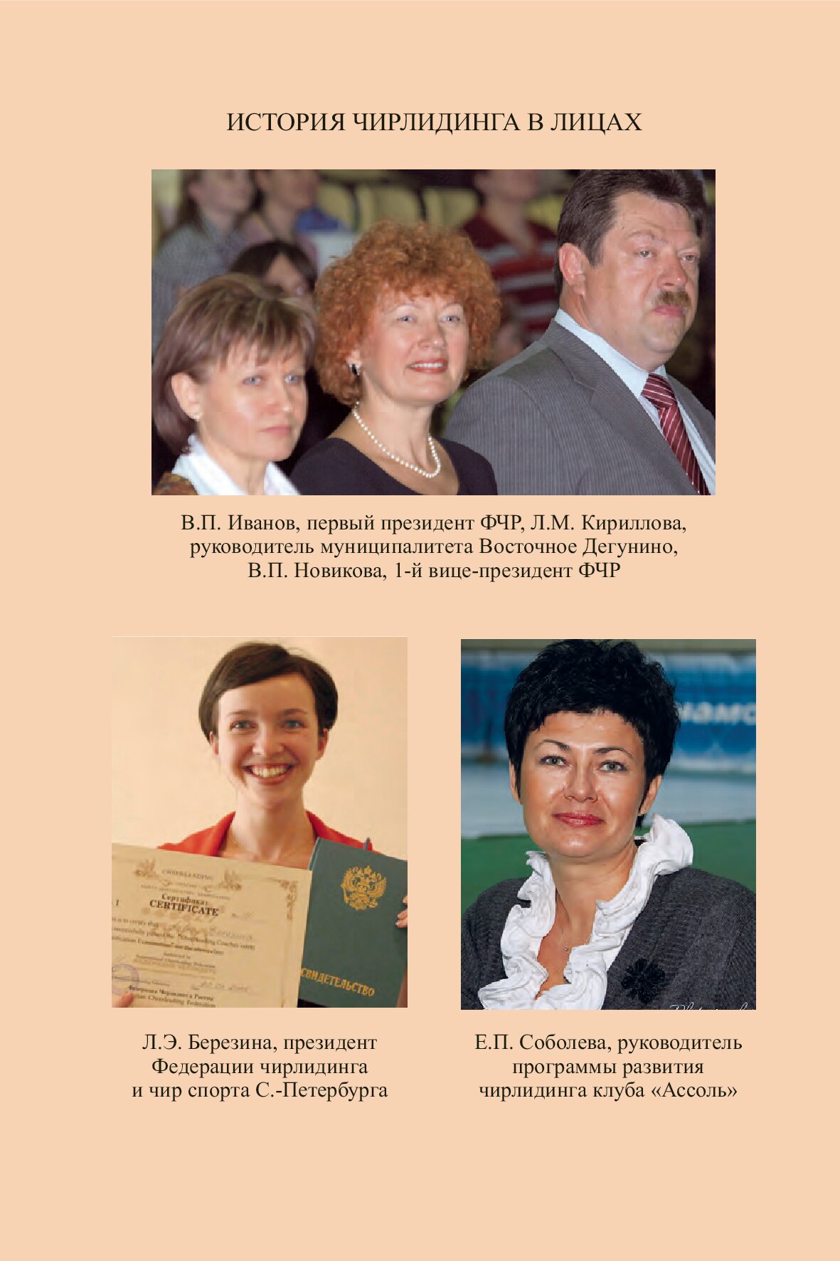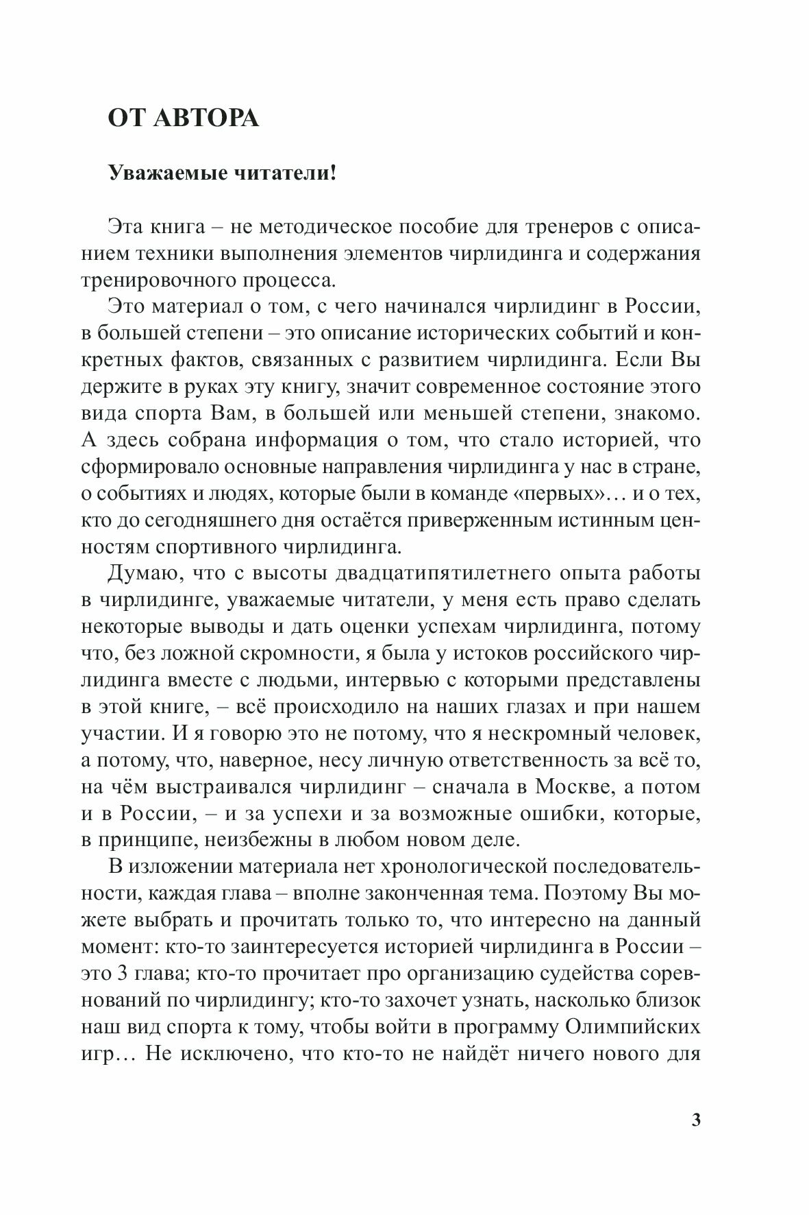 Книга содержит материалы по развитию чирлидинга (чир спорта) в России, начиная с 1995 года. Представлены некоторые документы, которые уже стали историческими фактами. Названы имена людей, стоящих у истоков российского чирлидинга и обозначена их роль в становлении вида спорта, официально признанного в России в 2007 году. Кроме этого, обозначен процесс интеграции российского чирлидинга в международное чирлидинговое движение и проблемы этого процесса, а также олимпийские перспективы чир спорта. Автор книги - первый вице-президент Федерации чирлидинга и чир спорта России с 2008 года, непосредственный участник первых чирлидинговых команд и соревнований и организатор порядка признания чирлидинга видом спорта и внесения его во Всероссийский реестр видов спорта. Для специалистов, спортсменов, всех интересующихся чир спортом.