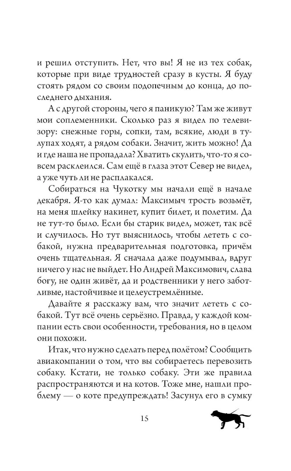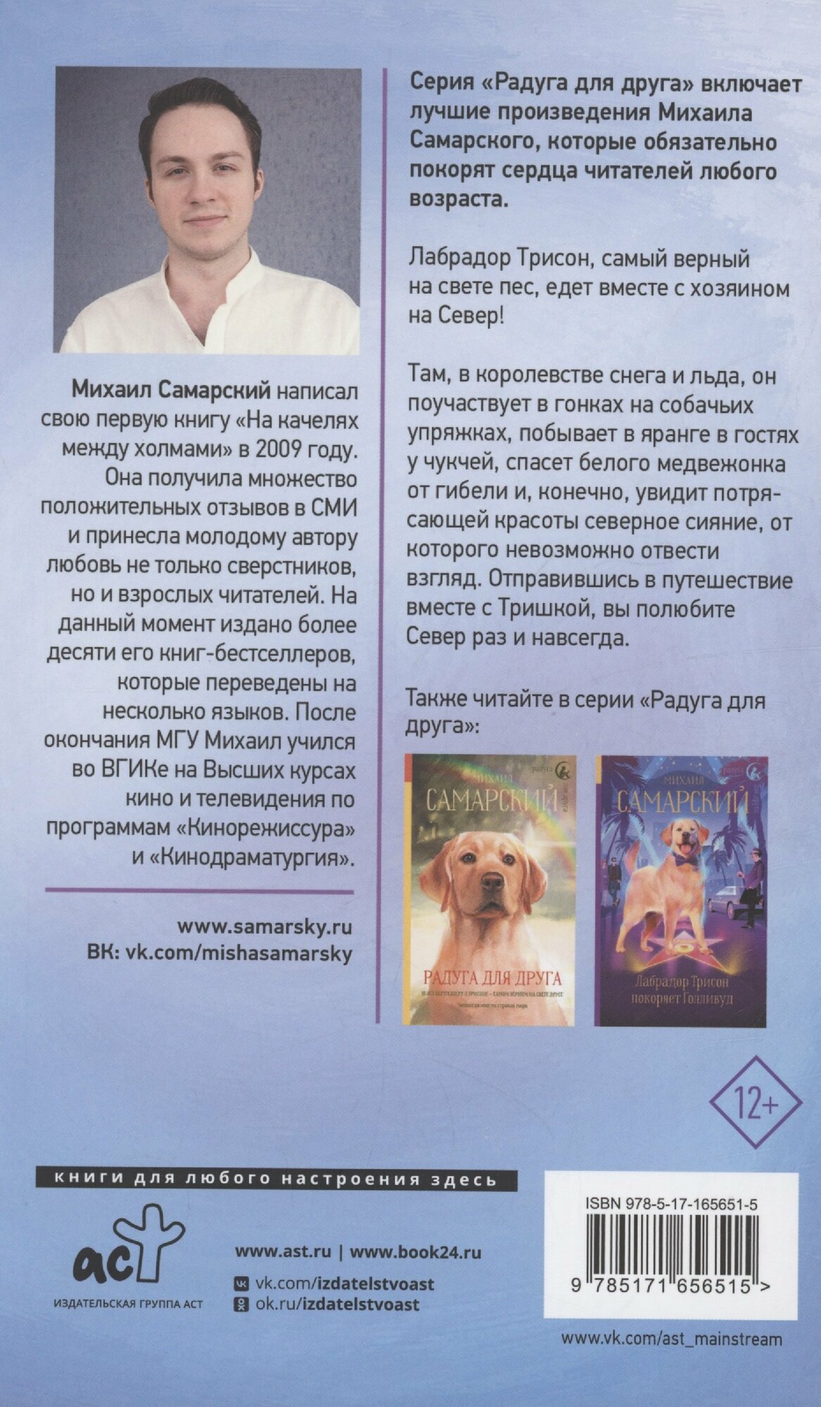 Лабрадор Трисон, самый верный на свете пес, едет вместе с хозяином на Север! Там, в этом королевстве снега и льда, он поучаствует в гонках на собачьих упряжках, побывает в яранге в гостях у чукчей, спасет белого медвежонка от гибели и, конечно, увидит потрясающей красоты северное сияние, от которого невозможно отвести взгляд. Отправившись в путешествие вместе с Тришкой, вы полюбите Север раз и навсегда.