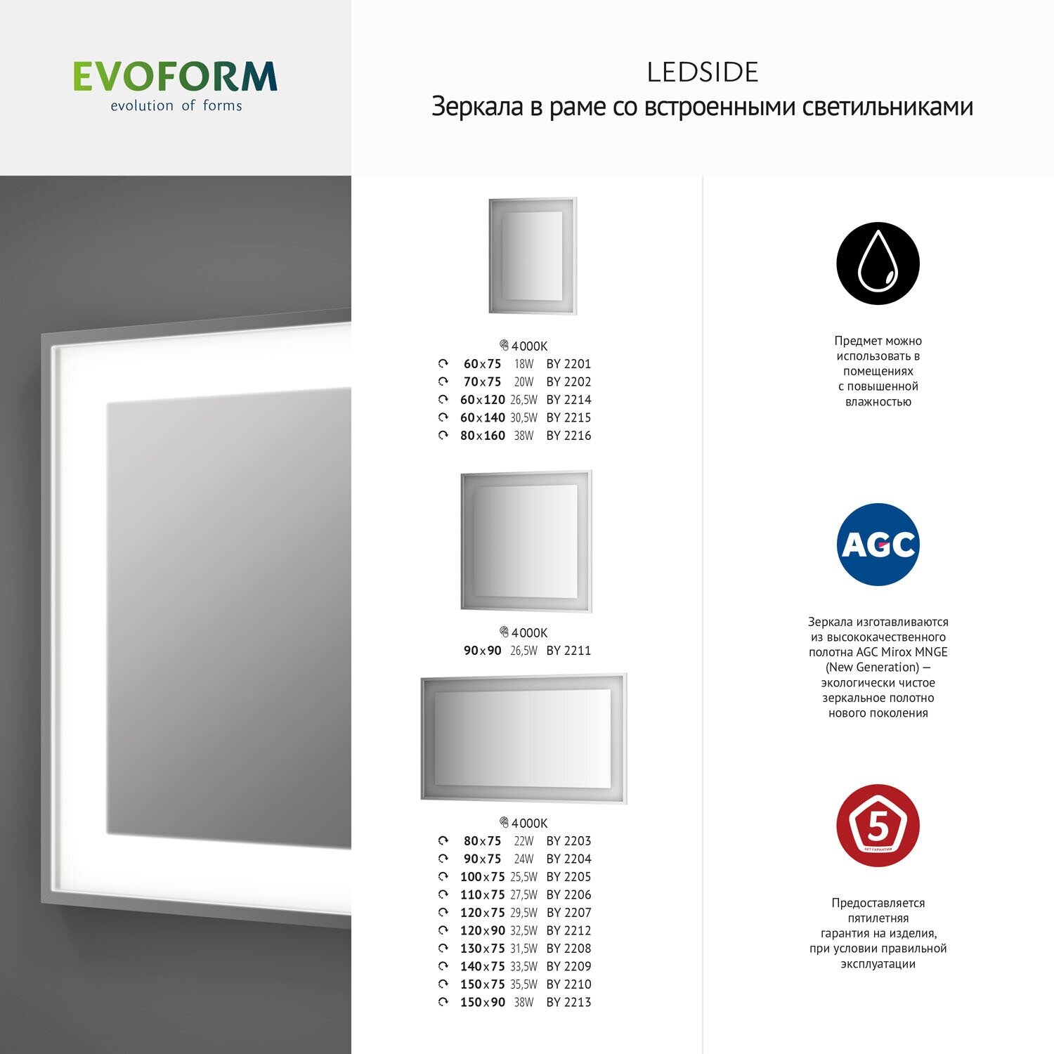 Зеркало Evoform Ledside 90х90 BY 2211 в багетной раме со встроенным LED-светильником 26.5 W - изготавливается из высококачественного полотна AGC Mirox MNGE (New Generation). Экологически чистое зеркальное полотно нового поколения. Можно использовать в помещениях с повышенной влажностью.