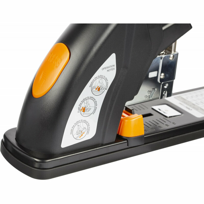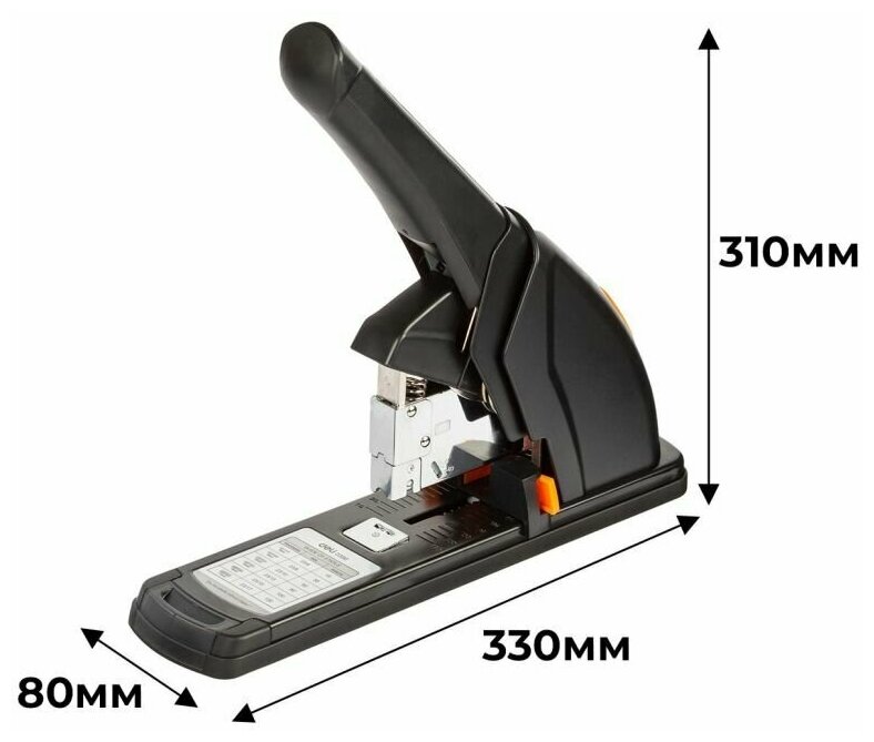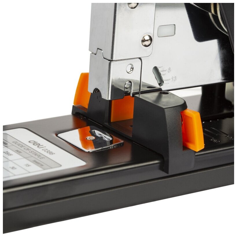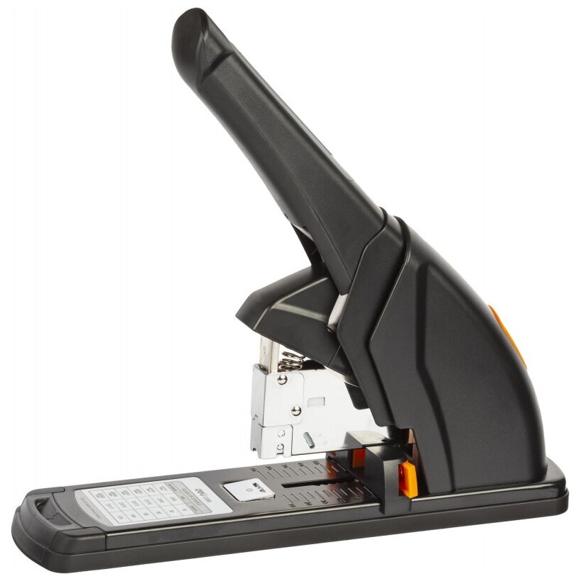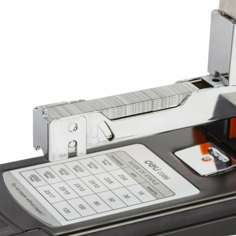 Мощный эргономичный канцелярский степлер Deli Effortless [] предназначен для качественного сшивания большого количества документов. Степлер оборудован надежным металлическим механизмом, который позволяет скреплять одновременно до 120 листов 70 граммовой печатной бумаги. Глубина сшивания листов регулируется от 10 - 60 мм. Также он оснащен специальной системой легкого открывания загрузочного отсека для скоб и встроенным контейнером для запасных скоб, что обеспечивает максимальный комфорт в работе.