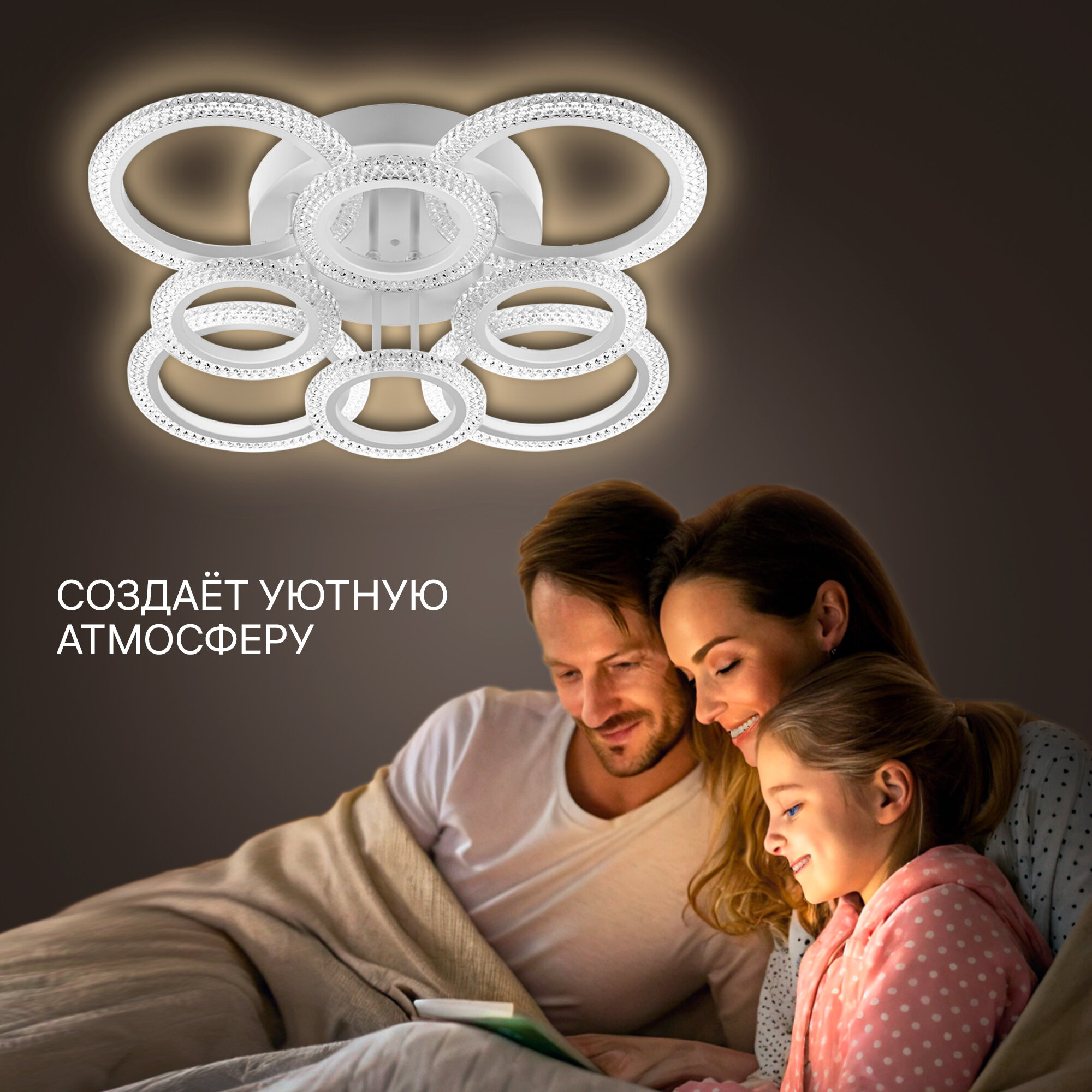 **Люстра светодиодная «Galassia» 515801** белого цвета может настраиваться как с помощью настенного выключателя, так и при помощи пульта управления. Он помогает менять цветовую температуру в диапазоне от 2700 до 6400 К, выбирая комфортный вариант. Допускается монтаж к низкому потолку с помощью планки. Люстра используется в помещениях площадью 35 м².