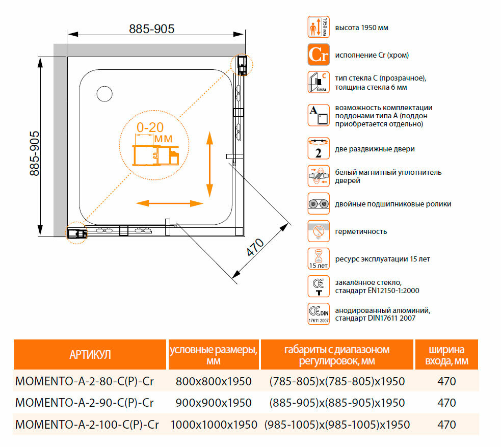 Модель: Momento 100х100 MOMENTO-A-2-100-C-Cr без поддона, стекло прозрачное, профиль хром