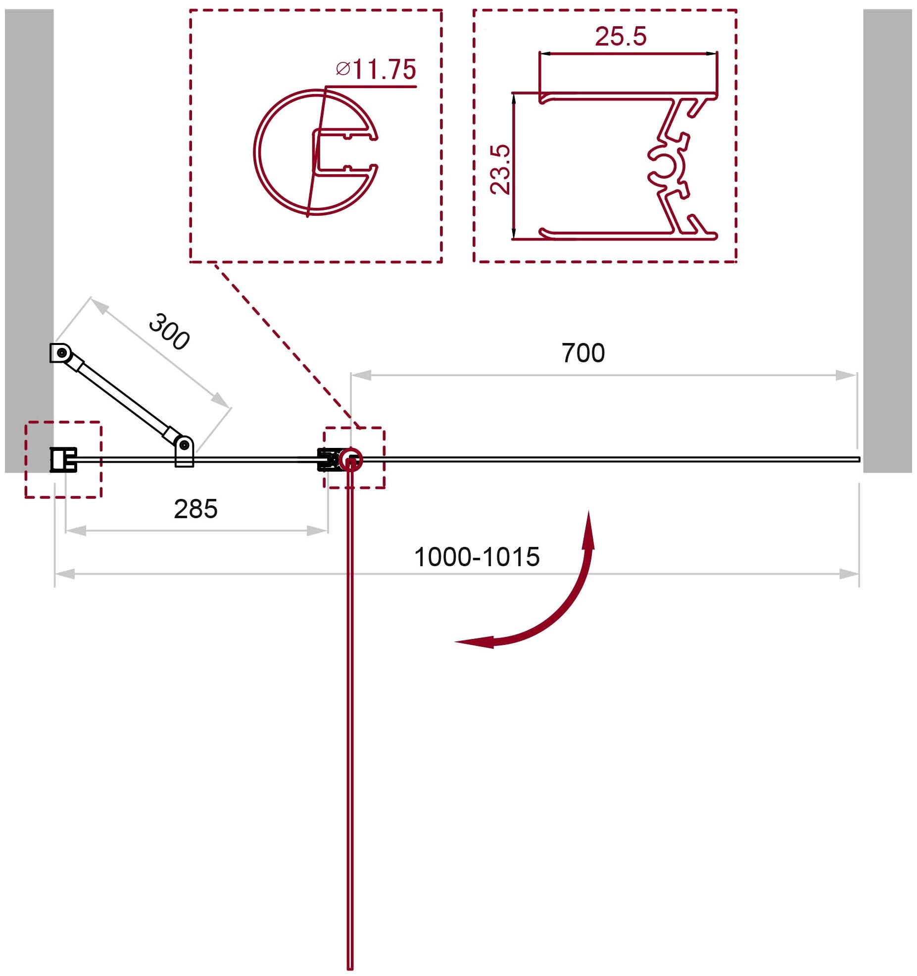 - Регулировка ширины предусмотрена за счет боковых профилей, что позволяет без проблем установить изделие даже при кривизне стен.