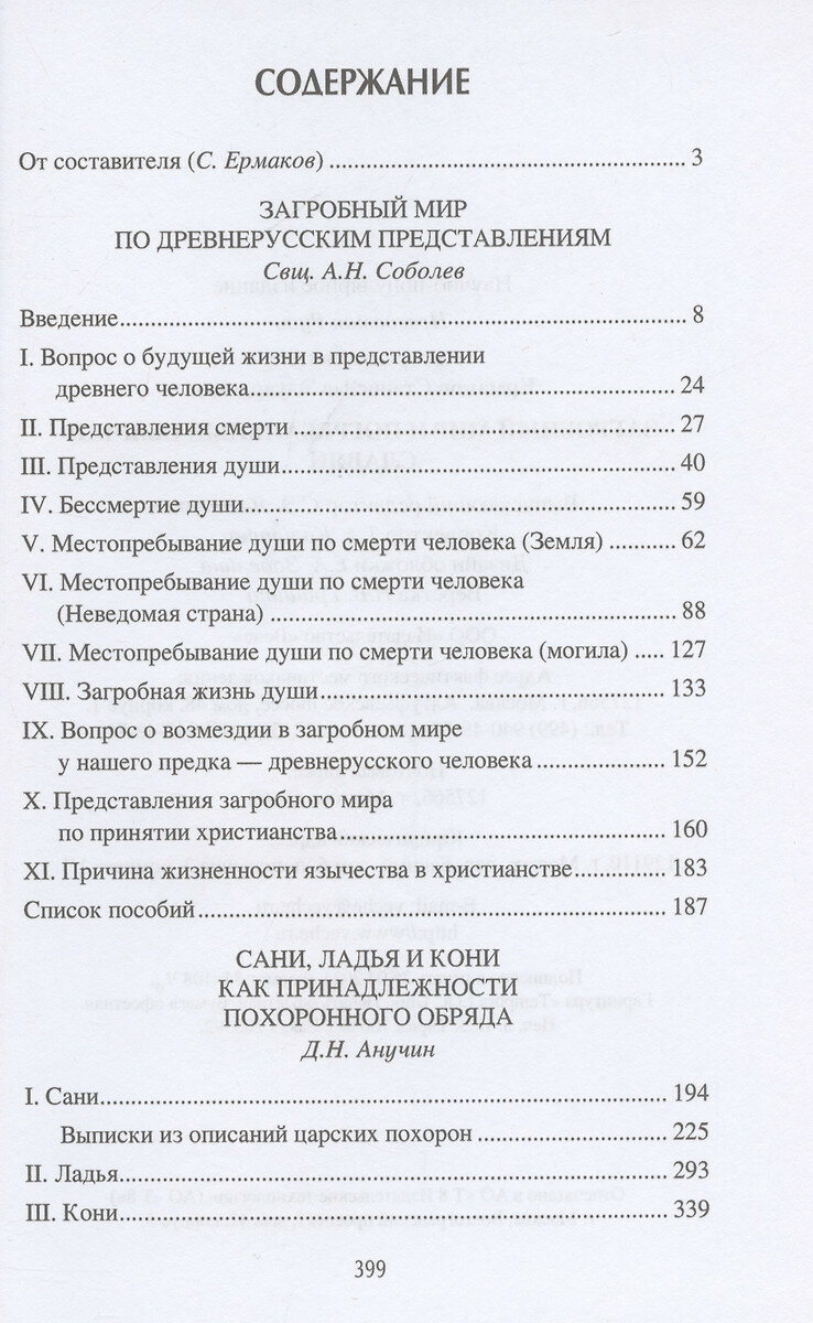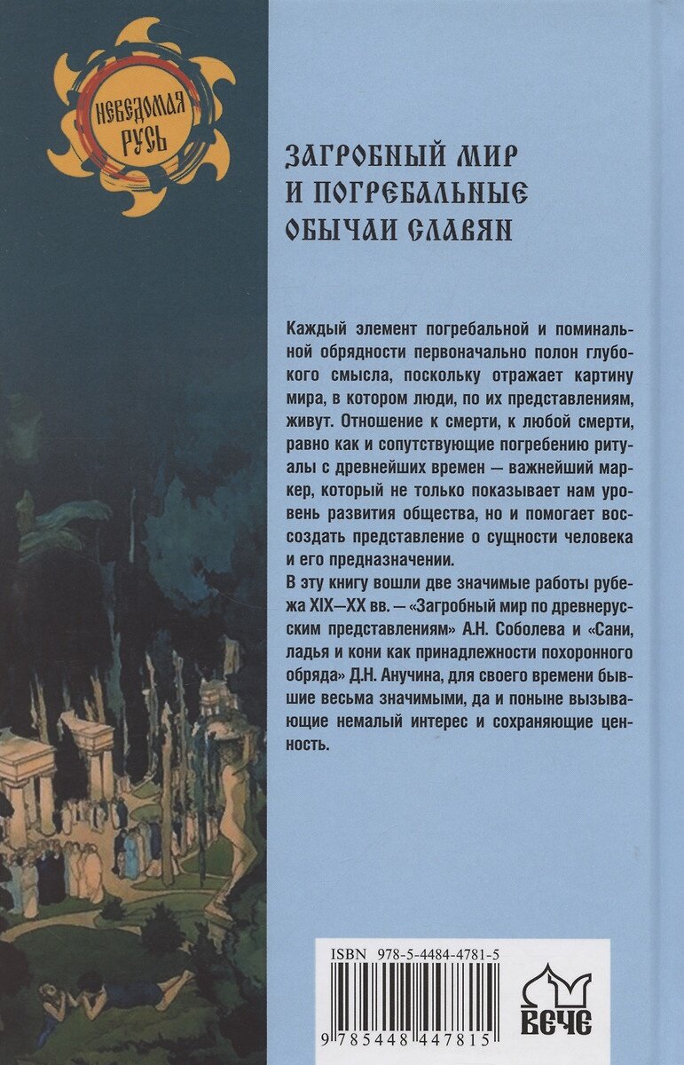В эту книгу вошли две значимые работы рубежа XIX-XX вв. - "Загробный мир по древнерусским представлениям" А.Н. Соболева и "Сани, ладья и кони как принадлежности похоронного обряда" Д.Н. Анучина, для своего времени бывшие весьма значимыми, да и поныне вызывающие немалый интерес и сохраняющие ценность.