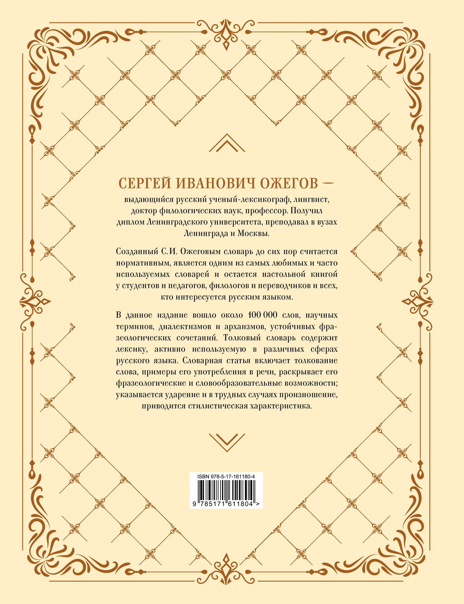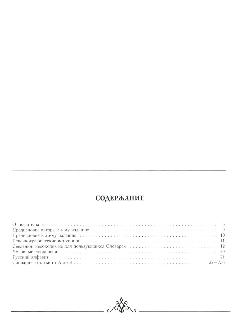 Толковый словарь С. И. Ожегова является одним из самых известных, авторитетных и любимых. В данное издание вошло около 100 000 слов, научных терминов, диалектизмов и архаизмов, устойчивых фразеологических сочетаний. Толковый словарь содержит лексику, активно используемую в различных сферах русского языка. Словарная статья включает толкование слова, примеры его употребления в речи, раскрывает его фразеологические и словообразовательные возможности; указывается ударение и в трудных случаях произношение, приводится стилистическая характеристика. Новые словарные статьи распределены в общем тексте и выделены специальным полиграфическим знаком (?). Однотомный словарь также служит руководством к правильному написанию слов в современном русском литературном языке.