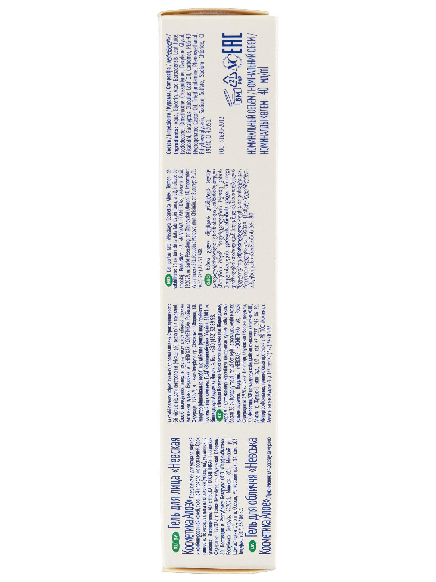 | Состав | aqua, glycerin, aloe barbadensis leaf juice, isododecane, dimethicone crosspolymer, decylene glycol, bisabolol, eucalyptus globulus leaf oil, carbomer, peg-40 hydrogenated castor oil, тriethanolamine, phenoxyethanol, ethylhexylglycerin, sodium sulfate, sodium chloride, сi 19140, ci 42051. |