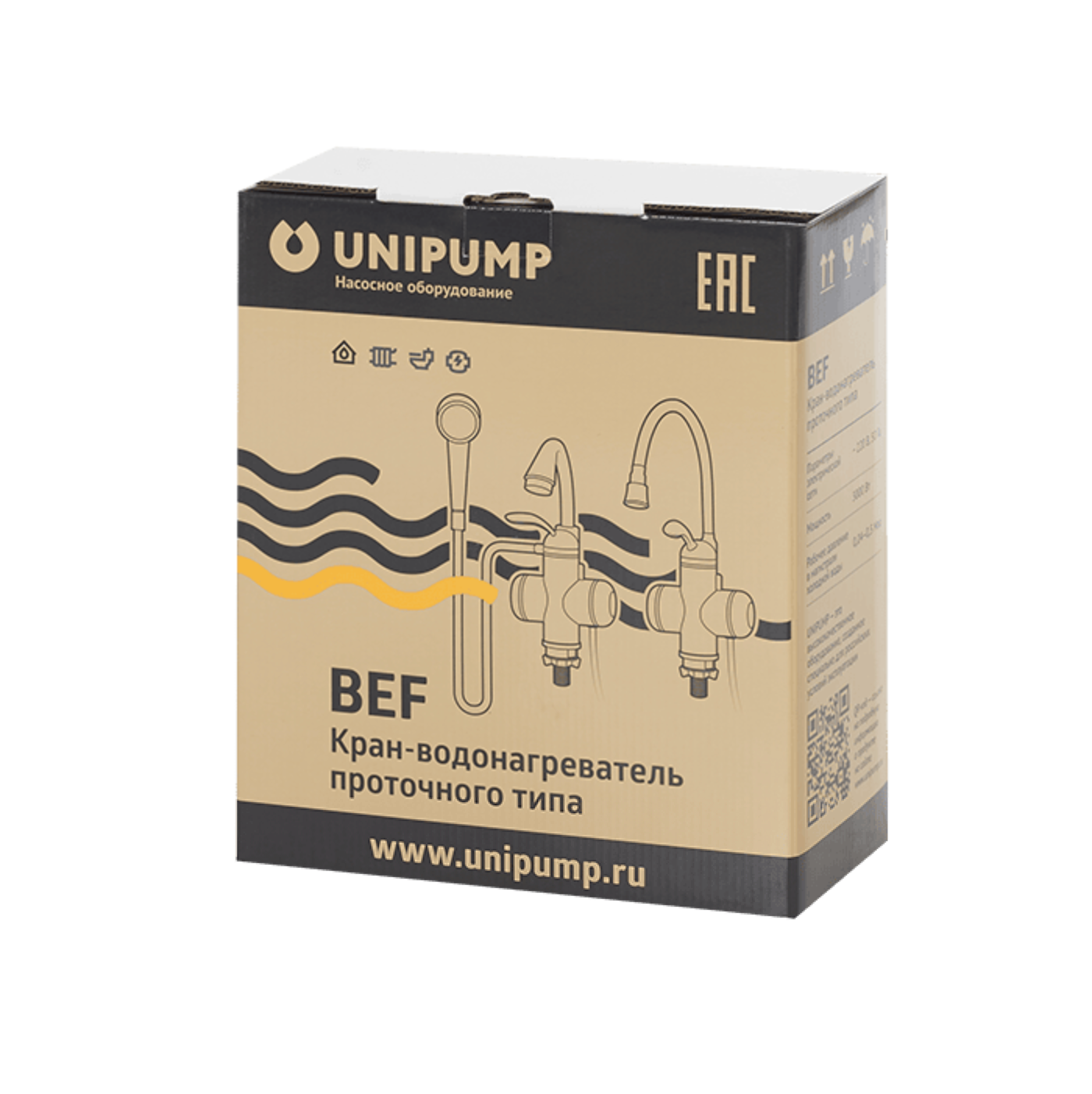 Электрические краны-водонагреватели UNIPUMP серии BEF выполнены в виде смесителей и предназначены для быстрого нагрева проточной холодной воды для бытовых целей в помещениях, где по какой-либо причине нет возможности или целесообразности провести горячую воду или поставить накопительный водонагреватель. Краны-водонагреватели не предназначены для работы в неотапливаемых помещениях, подключаются к магистрали холодного водоснабжения с давлением от 0,04 до 0,5 МПа и бытовой электрической сети 220 В. Кран-водонагреватель является современным, надежным и безопасным устройством, которое позволяет избежать затрат сил, средств и времени на приобретение дополнительного оборудования и дающее все преимущества пользования горячей водой.