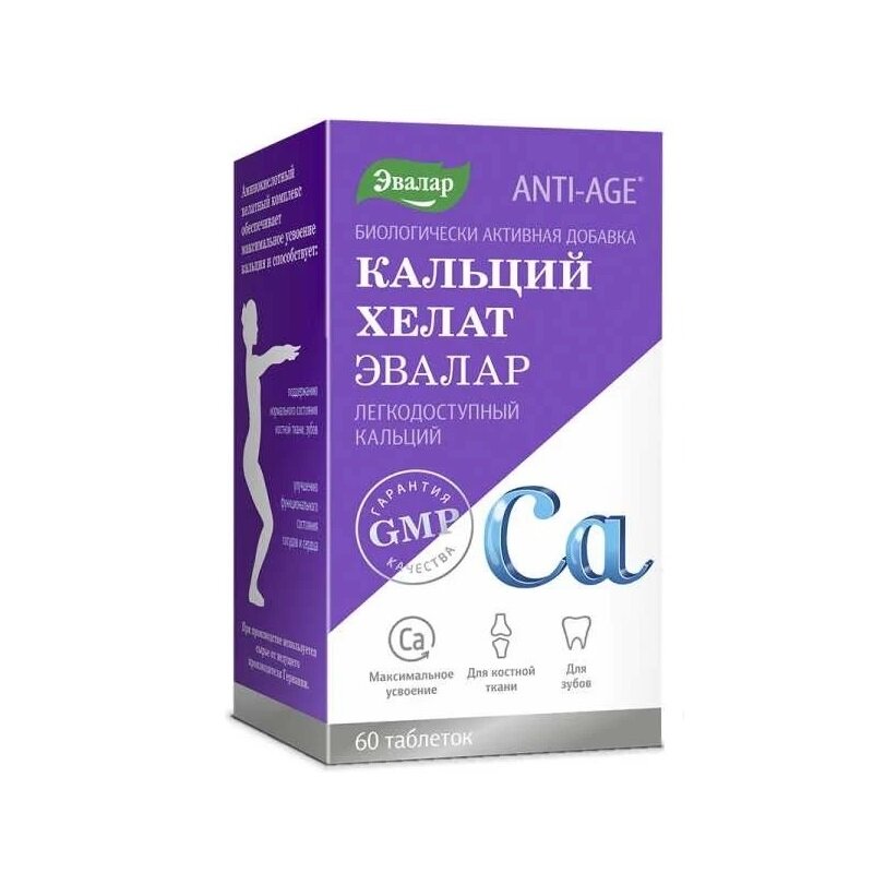 Аминокислотный хелатный комплекс для максимального усвоения кальция Кальций хелат Эвалар:Обеспечивает максимальное усвоение кальция;Быстро восполняет дефицит кальция в организме; Поддерживает нормальное состояние костной ткани, зубов; Способствует улучшению функционального состояния сосудов и сердца. Преимущества хелатной формы кальцияОбладает высокой биодоступностью – способна усваиваться на 90-98%;Не влияет на уровень желудочной кислотности;Не вызывает вздутия и нарушения пищеварения;При приеме не происходит отложение нерастворимых осадков на стенках кровеносных сосудов, которое может вызывать развитие кальциноза и привести к хрупкости сосудов и суставов.Способна проникать через барьер плаценты беременных и питать развивающийся плод.