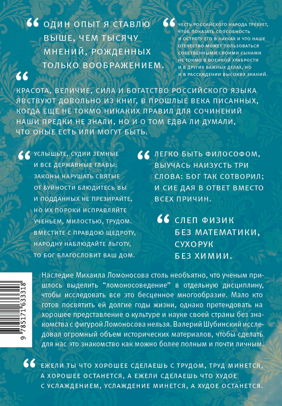 Получивший блестящее образование и заняв важное положение, Ломоносов не понаслышке знал, что такое нищета, голод, бесправие — все это он пережил. Поэтому как никто другой понимал проблемы и беды простого человека. Ломоносову было мало наук и поэзии, его смолоду тянуло к общественной деятельности, он мечтал о роли реформатора, законодателя, преобразователя России. И исследование Валерия Шубинского убедительно доказывает, что влияние блестящих идей этого выдающегося человека мы ощущаем до сих пор. Недаром А. С. Пушкин писал, что Ломоносов «сам был нашим первым университетом».