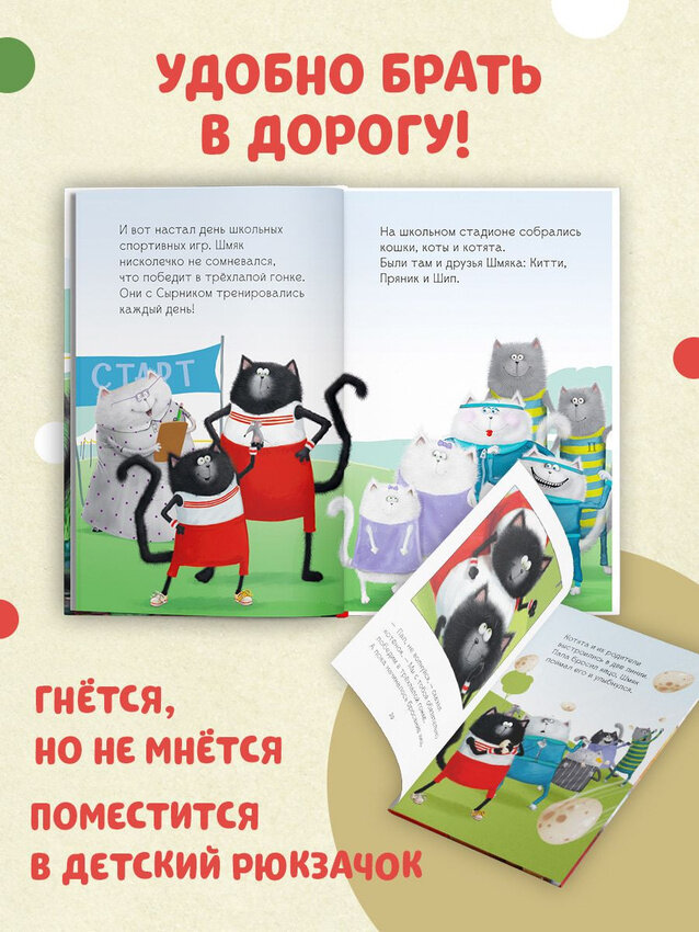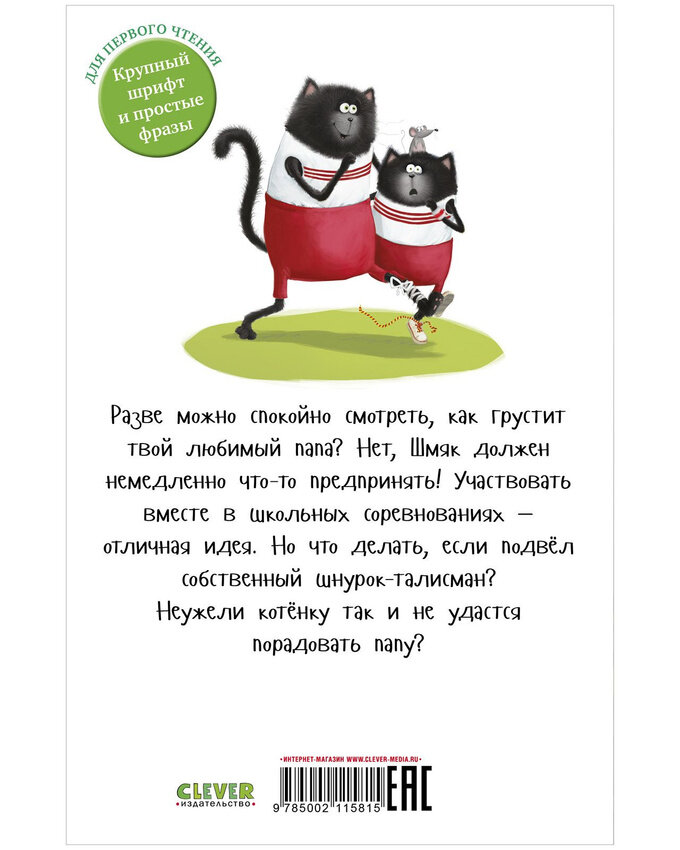 Разве можно спокойно смотреть, как грустит твой любимый папа? Нет, Шмяк должен немедленно чтото предпринять! Участвовать вместе в школьных соревнованиях отличная идея. Но что делать, если подвёл собственный шнурок-талисман? Неужели котёнку так и не удастся порадовать папу?