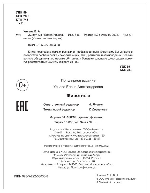 Умная энциклопедия Животные Ульева Е. (Елена Александровна Ульева); Феникс, 2022