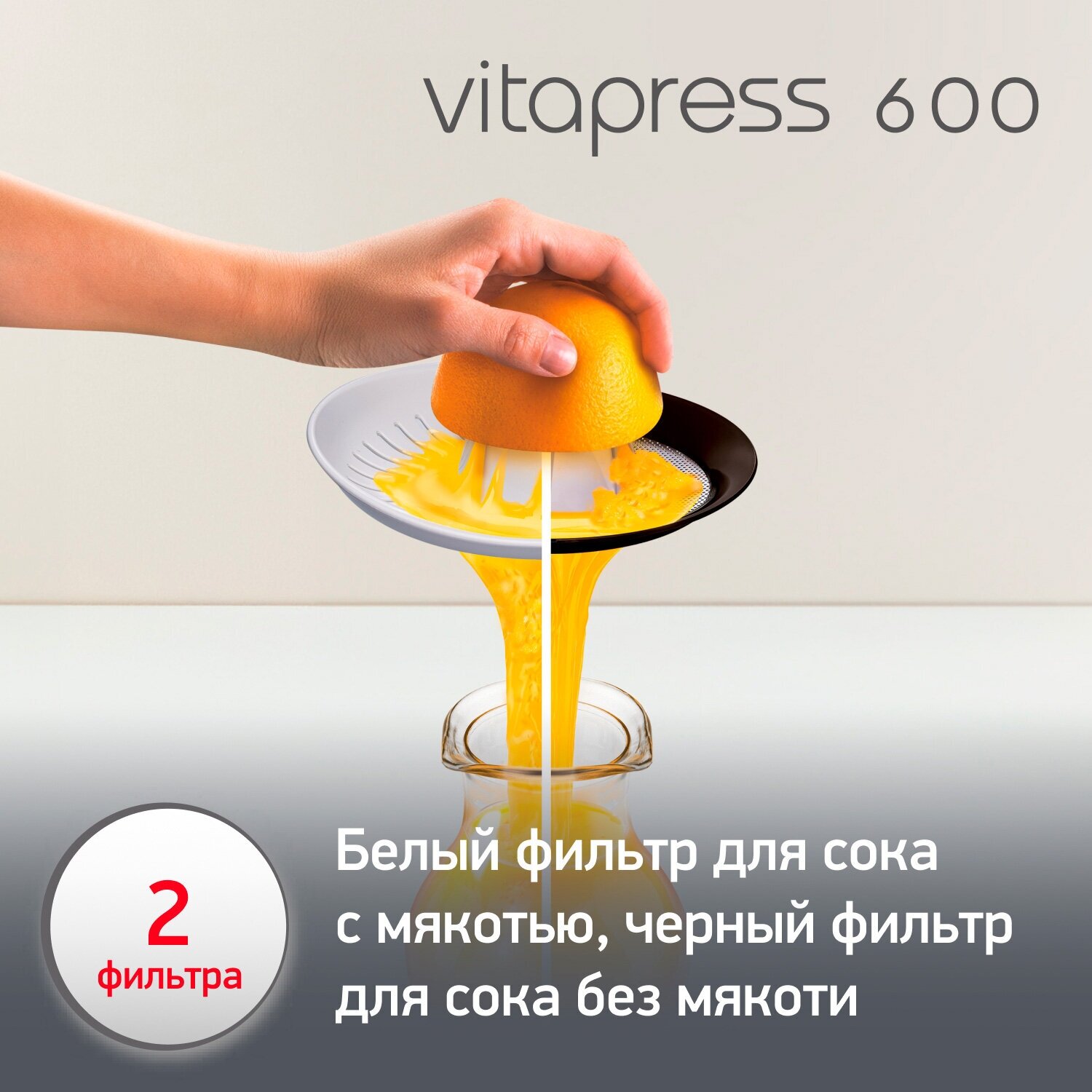 Побалуйте себя свежим соком цитрусовых вместе с электрической соковыжималкой Vitapress 600. С помощью металлического фильтра с мелкими отверстиями вы можете регулировать количество мякоти в вашем напитке. Эта соковыжималка для цитрусовых работает быстро и эффективно благодаря двум направлениям вращения конуса и автоматическому включению и выключению.