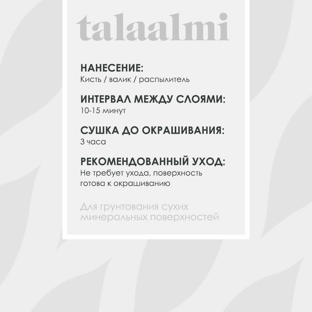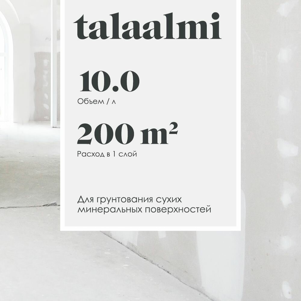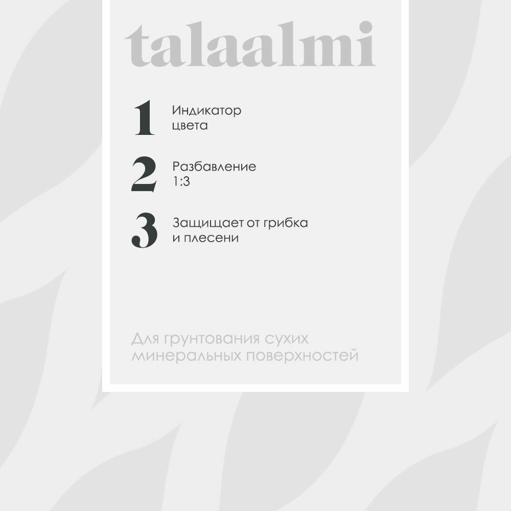 Водно-дисперсионная полиакриловая грунтовка TALATU talaalmi глубокого проникновения для внутренних и наружных работ. Защищает от плесени и грибка. Укрепляет поверхность, улучшает адгезию финишного покрытия. Благодаря индикатору цвета удобно контролировать нанесение.НазначениеДля грунтования минеральных поверхностей (штукатурные растворы, бетон, цементно-волокнистые плиты), гипсокартона под окрашивание водно-дисперсионными красками, а также для пылесвязывающей обработки бетонных полов под покрытие рулонными материалами. Препятствует вторичному заражению плесневыми грибами, снижает непроизводительные потери краски. Не применять под покрытия из масляных и алкидных красок.СоставВода, водная дисперсия акрилового сополимера, добавки.Инструкция по применению1. Подготовка поверхности. Поверхность очистить от пыли, загрязнений, зашпатлевать, отшлифовать. Защитить поверхности, не подлежащие грунтованию. Ремонтируемую поверхность расчистить от отслаивающейся краски, зашпатлевать, отшлифовать. Старую побелку удалить.2. Условия выполнения работ. Температура воздуха, грунтовки и обрабатываемой поверхности должна находиться в интервале от 10 °С до 25 °С при относительной влажности воздуха не более 80%.3. Грунтование. Приготовьте раствор добавлением воды в концентрат. Используйте пластмассовую тару, не применяйте оцинкованные ведра.Разбавление: стандартно: 2 части воды на 1 часть концентрата;для слабо впитывающих поверхностей: 3 части воды на 1 часть концентрата;для сильно впитывающих поверхностей: 1:1;для пылесвязывающей обработки полов: не разбавлять.Готовый раствор перемешать, наносить равномерно кистью, валиком, распылителем низкого давления или пневмораспылением. Приготовленный раствор хранить плотно закрытым не более 24 часов.