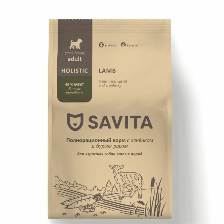 Полнорационный низкозерновой сухой корм для взрослых собак с ягненком, бурым рисом, морковью и клюквой.Ключевые особенности:Высокий процент мяса и мясных ингредиентов.Корма изготовлены из натурального сырья по стандарту качества HUMAN GRADE.Составы сухих кормов включают пребиотики, необходимые для здорового пищеварения питомца.Овощи, фрукты, ягоды и травы в составах являются источниками антиоксидантов, витаминов и минералов.Не содержит ГМО, сои, ароматизаторов, искусственных консервантов и красителей.Полнорационные и сбалансированные корма Savita класса холистик содержат высокий процент мясных ингредиентов, необходимых витаминов и минералов. Надолго обеспечивают собаку необходимой энергией на весь день.Каждый ингредиент тщательно подобран в соответствии с природными потребностями питомца и является важным компонентом в рецептуре корма, минимизируя риск возникновения аллергических реакций.Сбалансированная низкозерновая формула – в состав корма входит цельный бурый рис, который является источником углеводов, клетчатки, витаминов группы BНебольшие гранулы корма легко пережевываются растущими зубками щенка и не создают слишком сильную нагрузку на челюсть.Размер гранул: 7 мм.Состав:Дегидрированное мясо индейки 28 %, картофель, цельный бурый рис, гидролизованные мясо и печень ягненка 10%, жир птицы 11%, морковь, витаминно-минеральный комплекс, свекла, пивные дрожжи (естественный источник MOS), семена льна, плоды рожкового дерева, лососевое масло (естественный источник EPA и DHA), корень цикория (естественный источник FOS и инулина), люцерна, волокна гороха, клюква, таурин, эхинацея, экстракт розмарина и куркумы (комплекс натуральных антиоксидантов), Юкка Шидигера, L-карнитин, глюкозамин, хондроитин, антиоксидант. Гарантированный анализ:Сырой белок – 28 %Сырой жир – 17 %Сырая клетчатка – 3 %Сырая зола – 7 %Влажность – 9 %Кальций – 1,1 %Фосфор – 0,8 %Омега-3 – 0,28 %Омега-6 – 3 %Пищевые добавки (на 1 кг): витамин А 20000 МЕ, витамин Д3 1600 МЕ, витамин Е 400 мг, витамин С 100 мг, витамины группы В 2100 мг, медь (сульфат меди пентагидрат) 15 мг, цинк (сульфат цинка моногидрат) 140 мг, железо ( сульфат железа моногидрат ) 35 мг, марганец (сульфат марганца моногидрат) 40 мг, йод (йодат кальция) 2 мг, селен (селенит натрия) 0,2 мг.Энергетическая ценность: 345 кКал/100 гр.Рекомендации по кормлению:Корм вводить постепенно, в течение 5 дней смешивать с пищей, которую давали собаке ранее, после чего можно давать корм отдельно. Таблица по дневному рациону, представленная на упаковке, носит рекомендательный характер. Количество суточной нормы зависит от общего состояния, возраста и кондиции животного, а также от времени года.У животного всегда должен быть доступ к чистой питьевой воде.Страна-производитель: Россия.