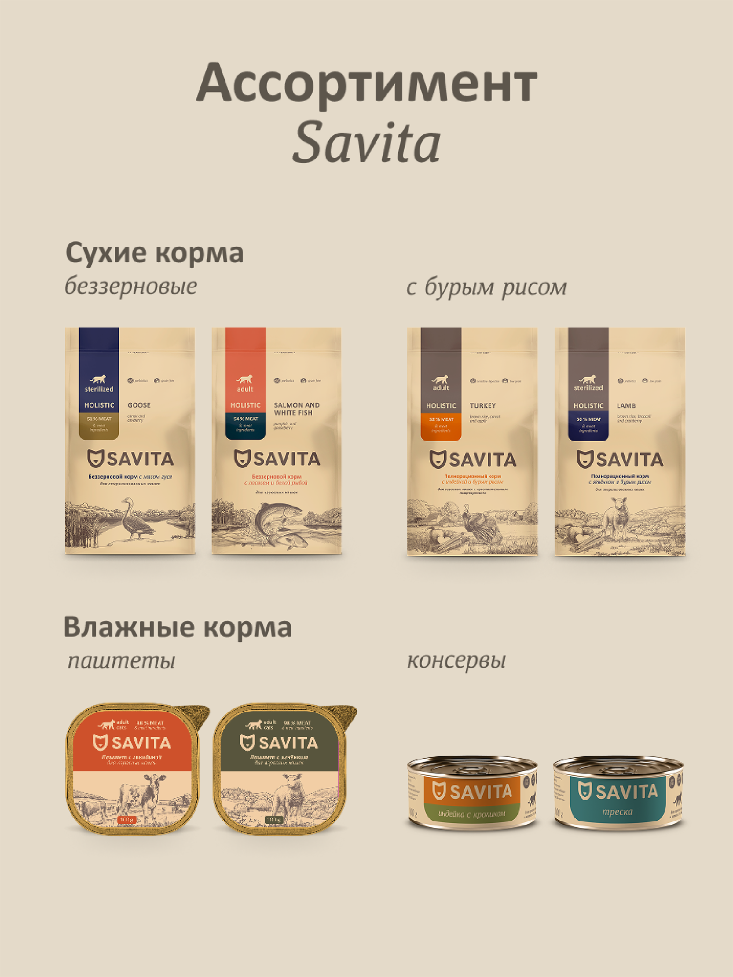 Беззерновые консервы класса holistic Savita - это сбалансированные натуральные рационы для кошек с высоким содержанием мяса, обогащенные витаминно-минеральным комплексом