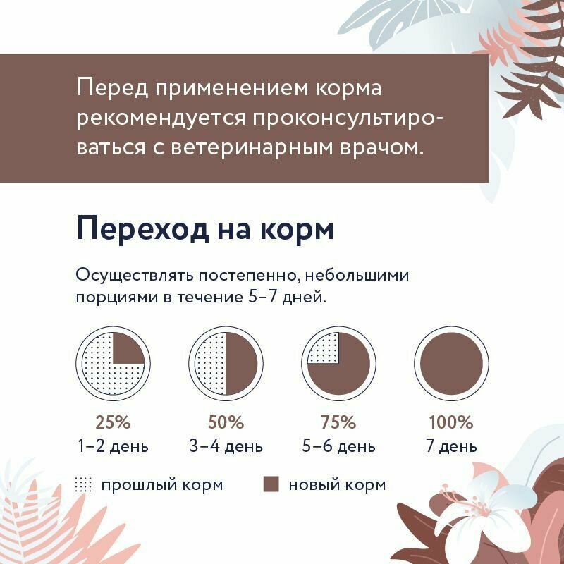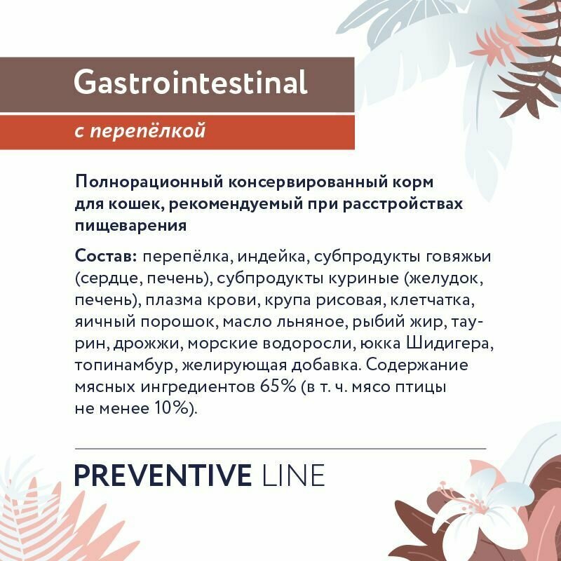 Florida Preventive Line – это линейка профилактических кормов для питомцев с разными физиологическими потребностями в питании. Рационы Florida Preventive Line содержат питательные компоненты, которые необходимы для поддержания здоровья и профилактики развития различных заболеваний у взрослых кошек и собак.Линейка Florida Preventive Line объединяет в себе природную пользу и современные технологии. Для производства используются высококачественное мясо и натуральные растительные ингредиенты, которые выращиваются и собираются вручную в экологически чистых районах России.Мясные консервы Florida Preventive Line Urinary – полнорационный диетический профилактический корм, который предназначен для поддержания здоровья мочевыделительной системы и профилактики образования струвитных уролитов.Перед применением корма рекомендуем проконсультироваться с ветеринарным врачом.Не содержит искусственных красителей, ароматизаторов или консервантов, ГМО.Рекомендации по кормлению: 30-40г на 1кг веса кошки.Суточная норма может варьироваться в зависимости от возраста, комплекции и уровня активности вашего питомца. Не забывайте своевременно пополнять миску свежей питьевой водой.Возможно смешанное кормление (сухой + влажный корм)Состав: утка, индейка, субпродукты куриные (желудок, печень), плазма крови, масло льняное, клетчатка, отруби пшеничные, яичный порошок, таурин, дрожжи, рыбий жир, морские водоросли, юкка Шидигера, клюква, травы почечный сбор, желе.Пищевая ценность на 100 г: продукта: - сырой протеин 10,0% - сырой жир 7,0% - углеводы 2,0% - Витамин А — 2000 МЕ - витамин D – 200 МЕ - витамин Е — 3,5 МЕ - кальций — 120 мг - фосфор — 100 мг Энергетическая ценность на 100 г: 101 ккал.Условия хранения: от 0°С до 25°С и относительной влажности воздуха не более 75%.Срок годности: 2 года с даты изготовления.
