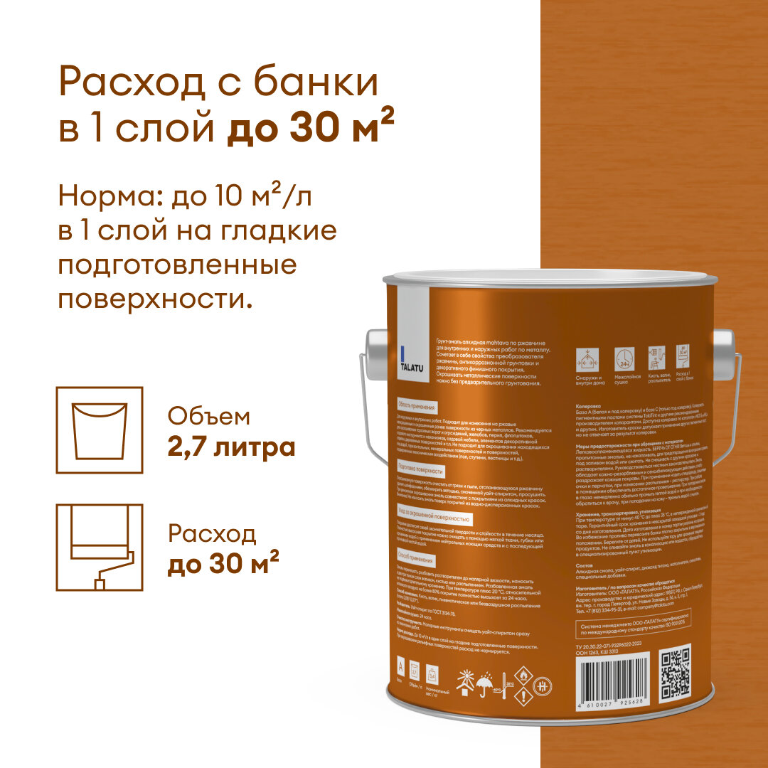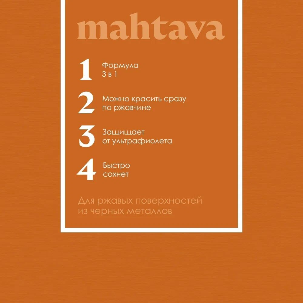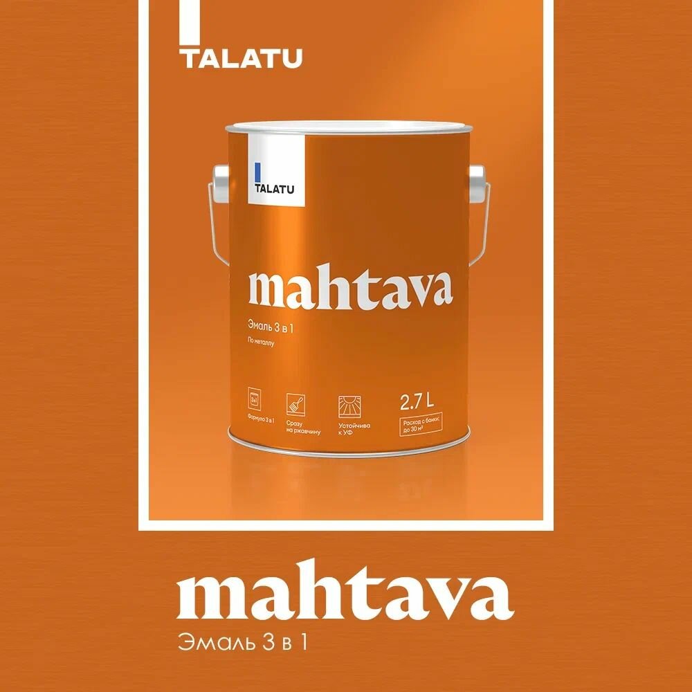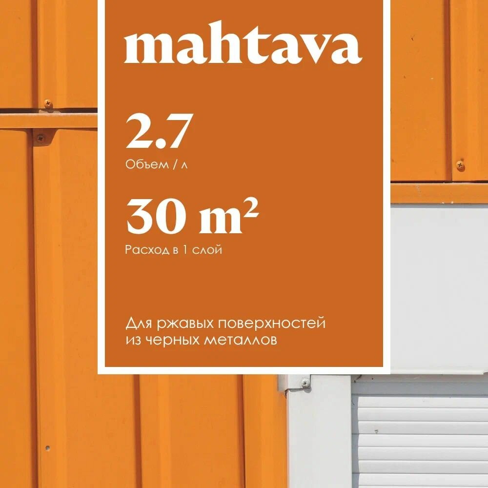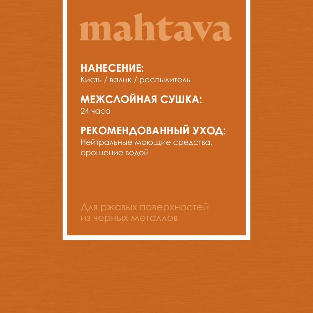 Грунт-эмаль алкидная Mahtava по ржавчине для внутренних и наружных работ по металлу. Сочетает в себе свойства преобразователя ржавчины, антикоррозионной грунтовки и декоративного финишного покрытия. Окрашивать металлические поверхности можно без дополнительной подготовки. Колеруется пигментными пастами TalaTint, по каталогам «NCS S», «RAL» в пастельные оттенки, также можно использовать самостоятельно как белую краску.
