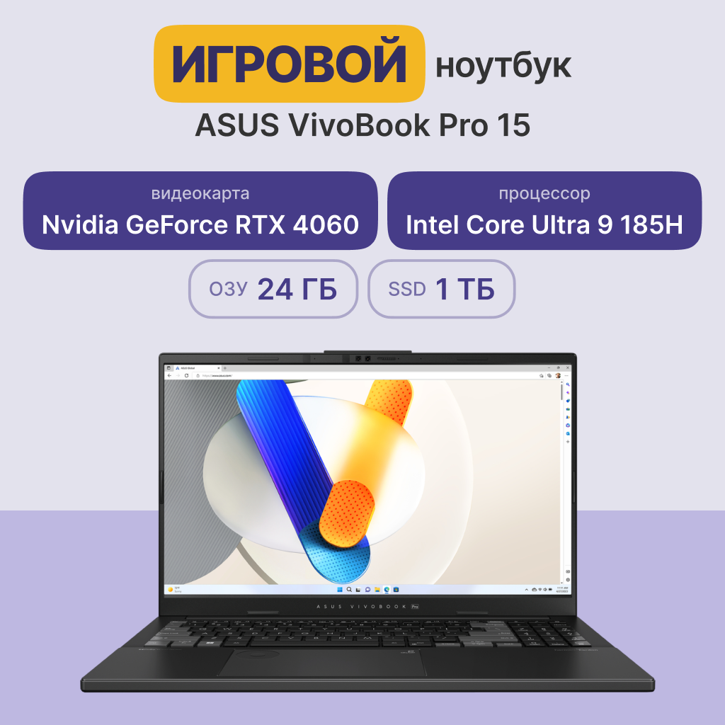 Ноутбук ASUS VivoBook Pro 15 OLED N6506MV-MA359 90NB12Y3-M004U0 (15.6" Core Ultra 9 185H 24Gb/ SSD 1024Gb GeForce® RTX 4060 для ноутбуков) Серый