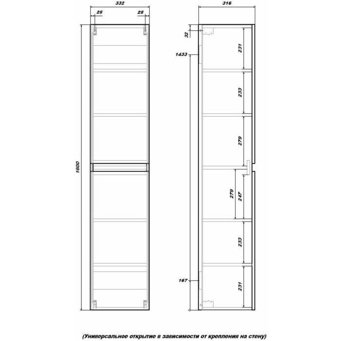 | Дополнительная информация | Правое или левое в зависимости от монтажа шкафа (можно перевернуть). Интегрированные ручки. Петли с доводчиками Boyard. |