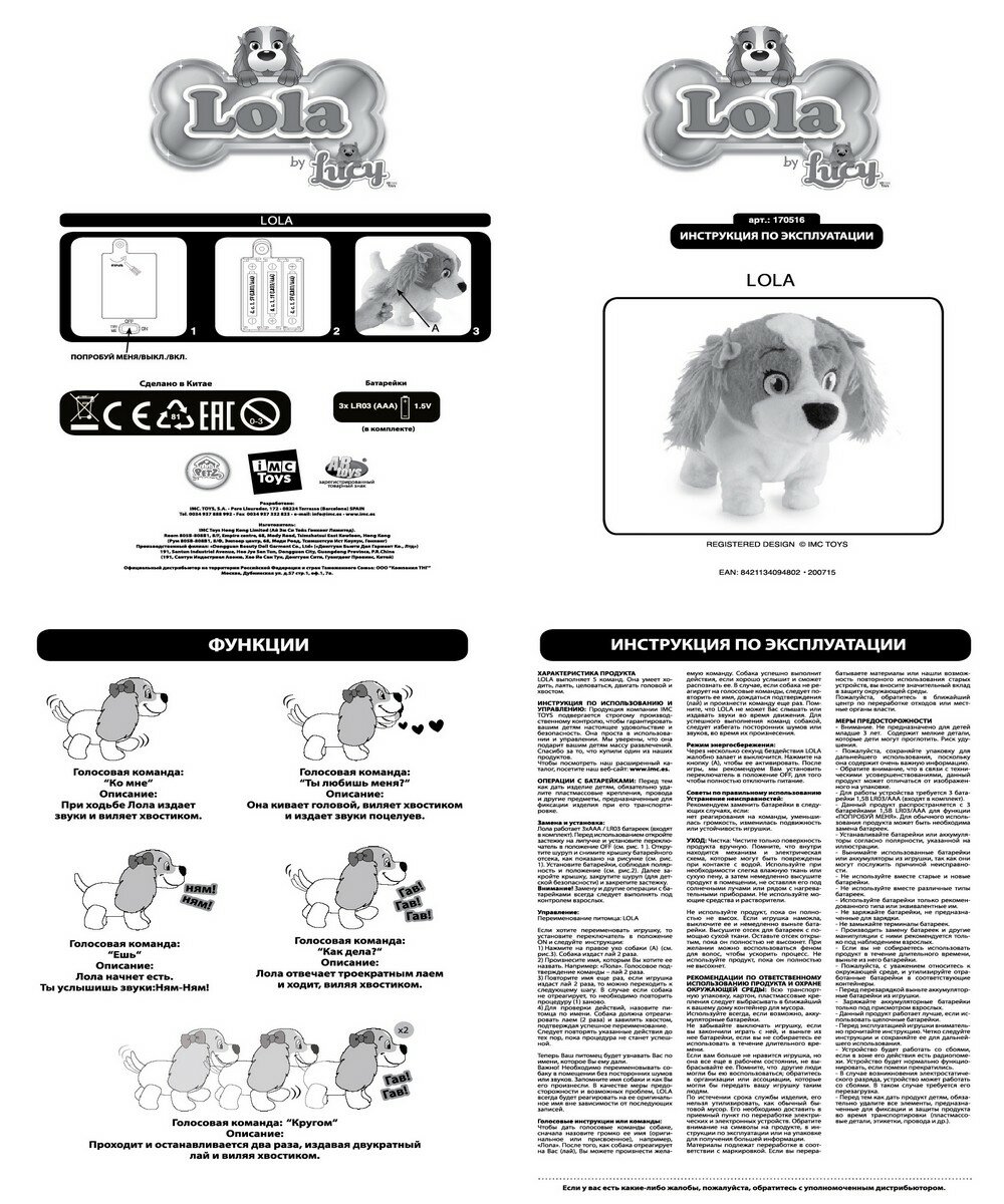 IMC Toys Hong Kong Limited Club Petz Собака Lola - прекрасный подарок для любого ребенка! Она умеет выполнять целых 5 команд. Младшая сестра собаки Lucy и может коммуницировать со своей старшей сестрой Lucy. Функции: выполняет 5 звуков выполняет 5 действий выполняет 5 команд коммуницирует с Lucy Дополнительно: работает от 3 батареек тип ААА, в комплекте. Инструкция внутри упаковки.