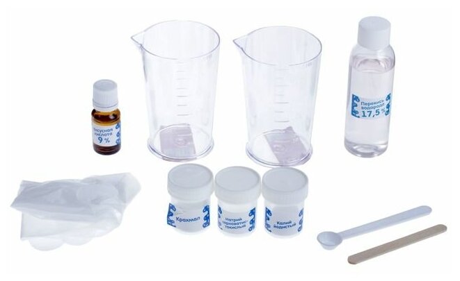 | Комплектация | стакан мерный - 1 шт; палочки для размешивания - 1 шт; шпатель-ложечка - 1 шт; пара перчаток - 1 шт; калий йодистый - 1 шт; крахмал - 1 шт; натрий серноватистокислый - 1 шт; уксусная кислота - 1 шт; перекись водорода - 1 шт; инструкция - 1 шт |