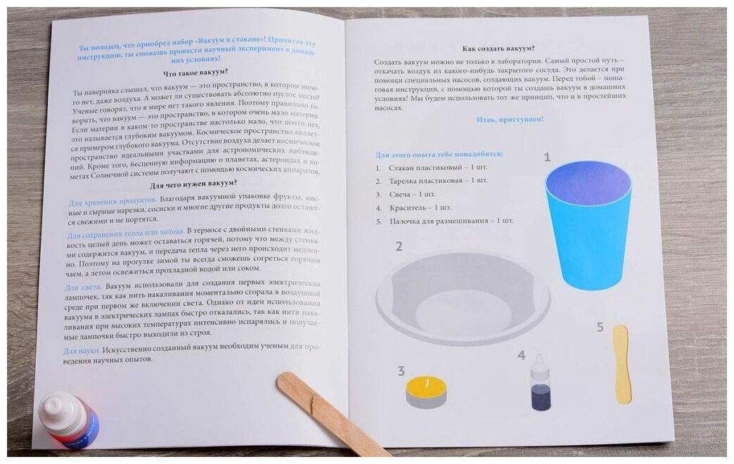 Набор для опытов "Вакуум в стакане" из серии "Юный физик" производителя Intellecto - это оригинальная развивающая игра для детей . Следуя инструкции, можно провести ряд экспериментов и создать вакуум в домашних условиях. Данный набор в игровой форме познакомит ребенка с тонкостями физики и позволит почувствовать себя настоящим ученым.