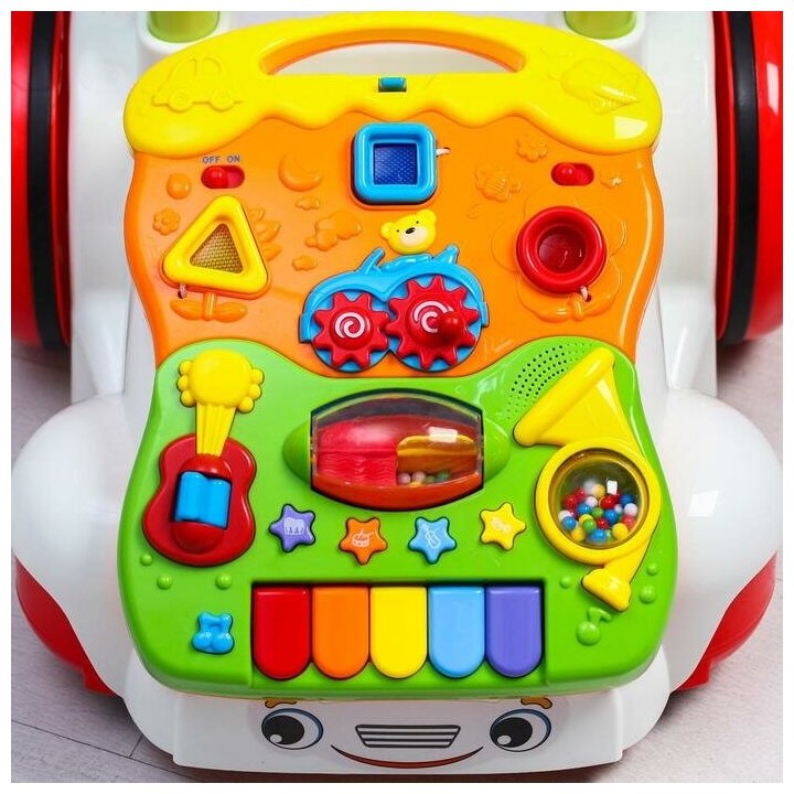Качественный пластик, не пахнет. Прорезиненные колеса, что ОЧЕНЬ важно, когда пол-ламинат. Колёса стопоры колёс (можно ускорить/замедлить) Устойчивый корпус, не заваливается назад. Многофункциональный игровой модуль: много различных мелодий, погремушки, шестеренка, небольшой сортер, регулировка звука. Модуль съемный, так что мы его используем и как отдельную игрушку.